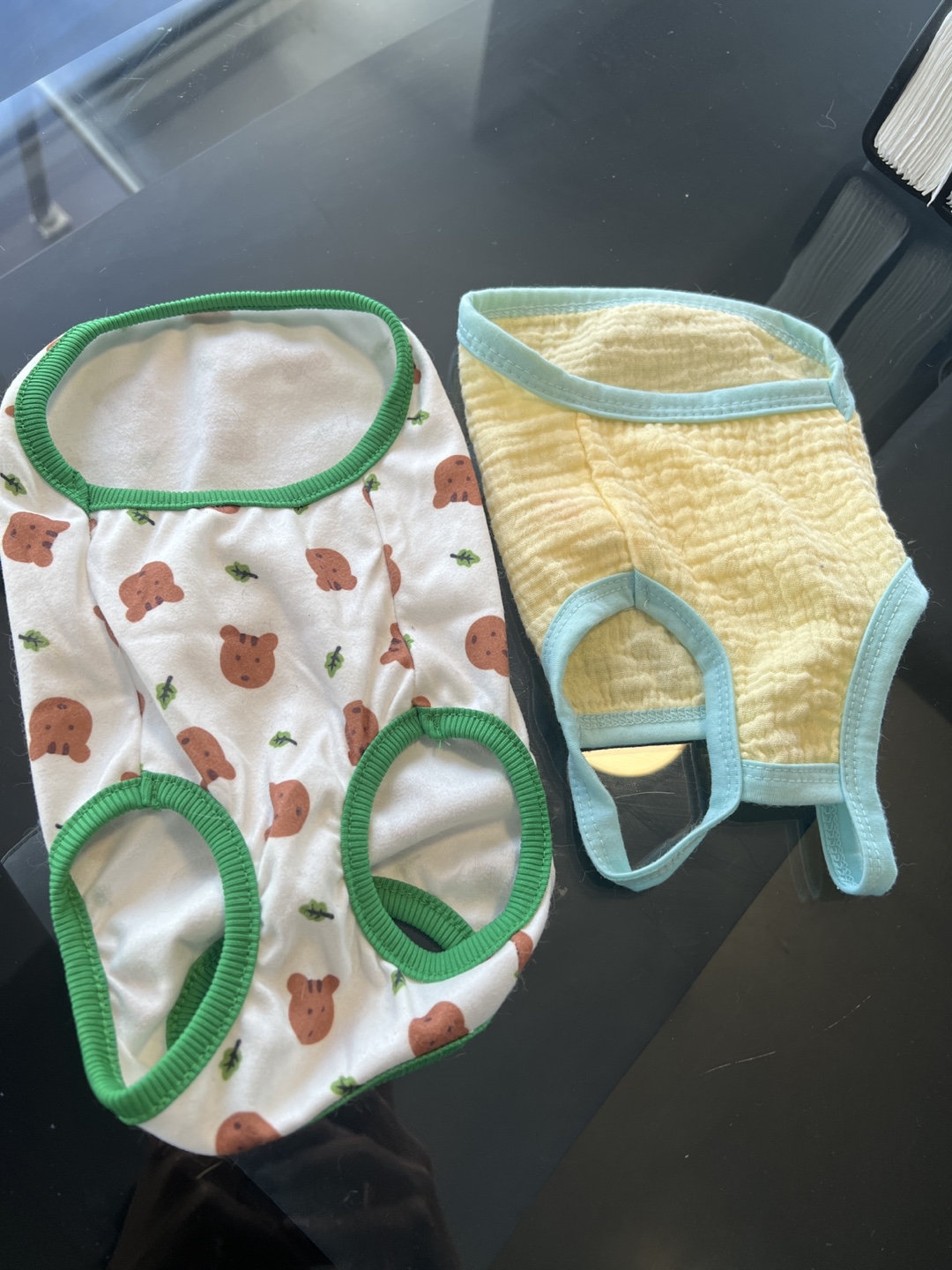Selling a set of two adorable dog/cat t-shirts! One is white with a bear and leaf pattern, and the other is a soft yellow with a bear design. Perfect for keeping your furry friend comfy and stylish!