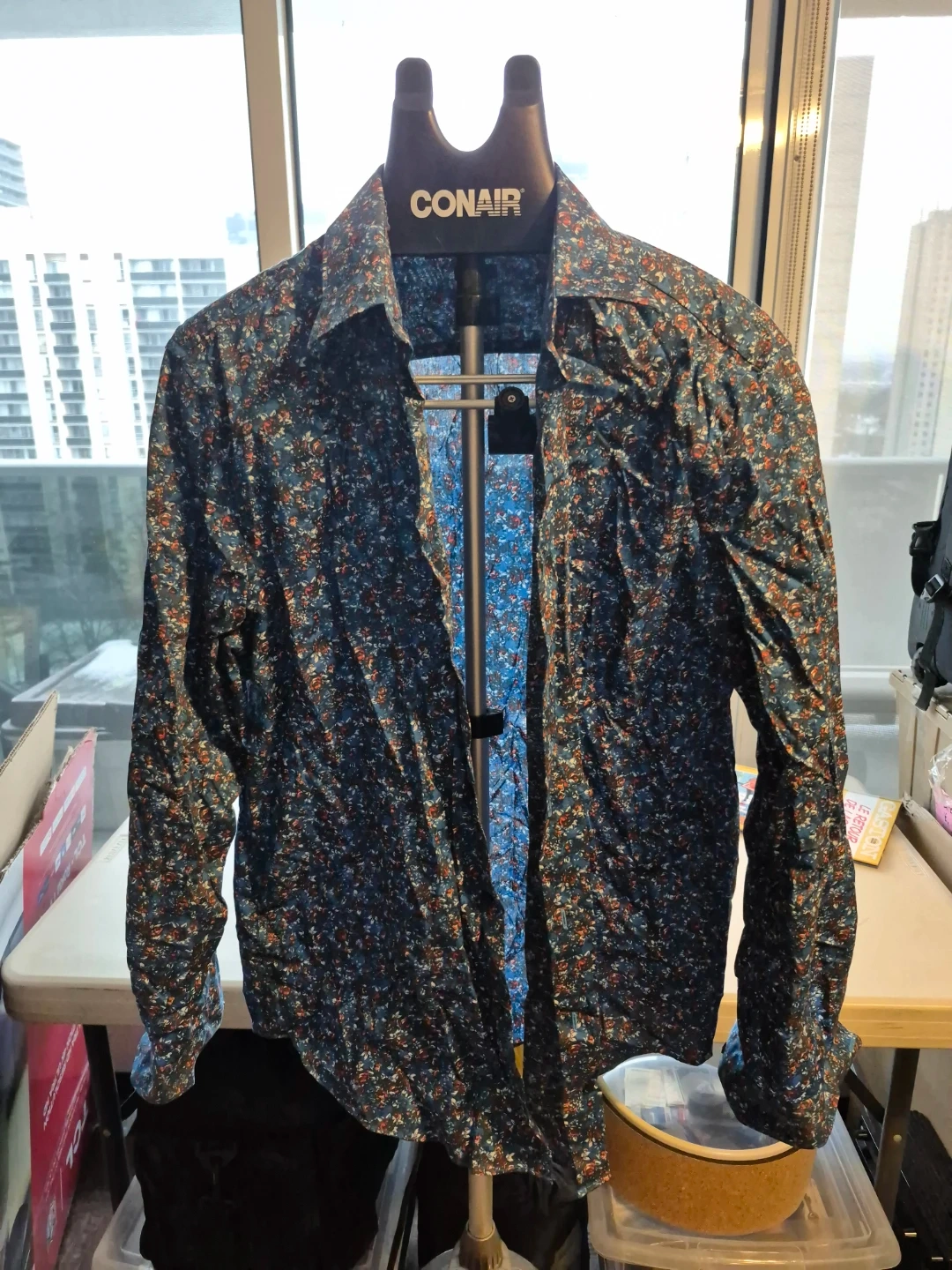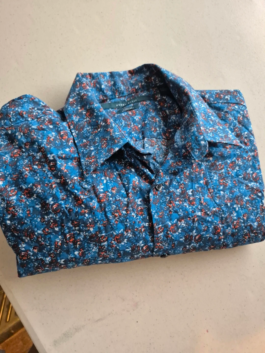 Selling a Perry Ellis button-down shirt in size large. It has a cool floral print and is made with stretchable fabric for extra comfort. The material is 98% cotton and 2% spandex