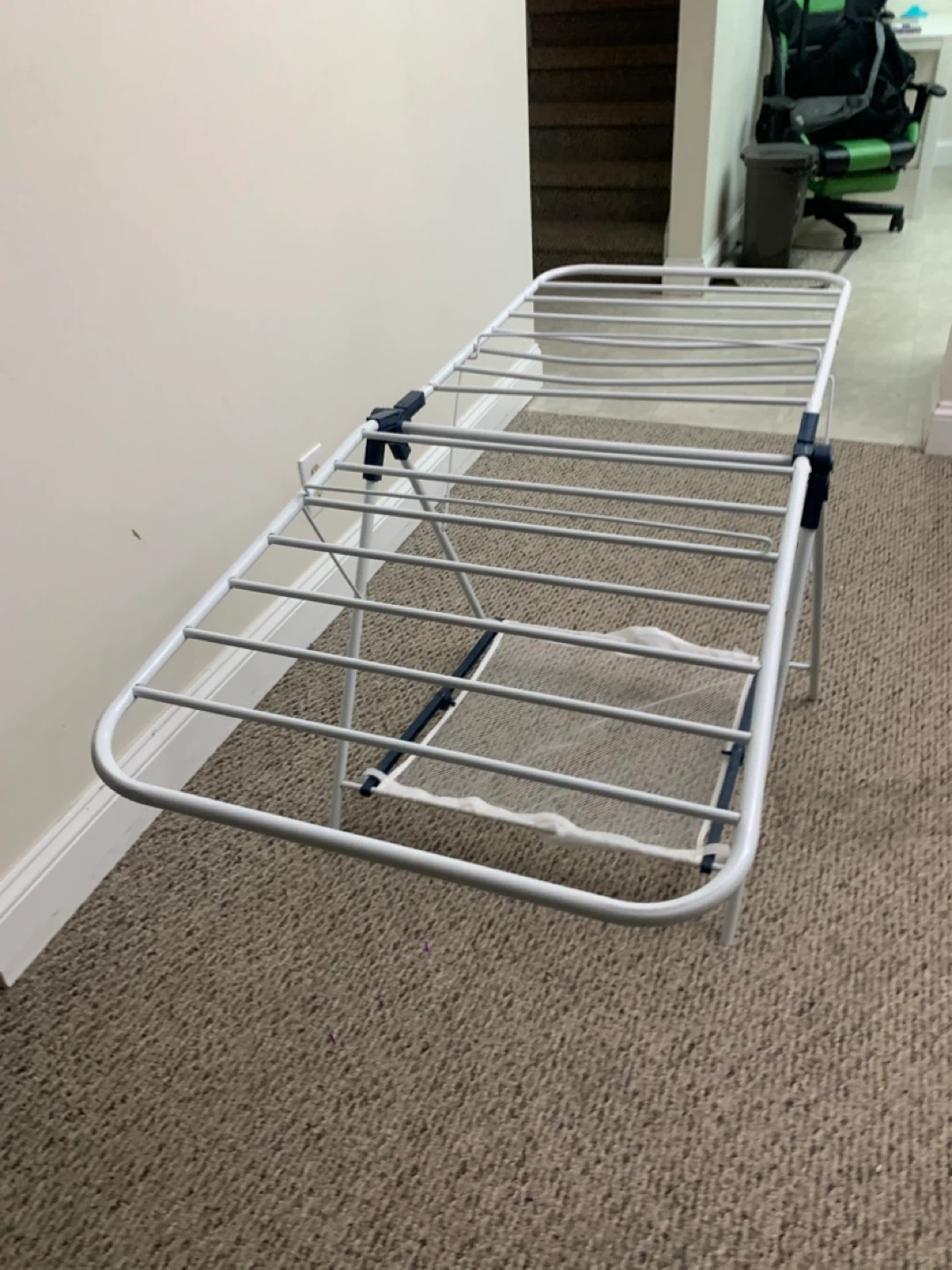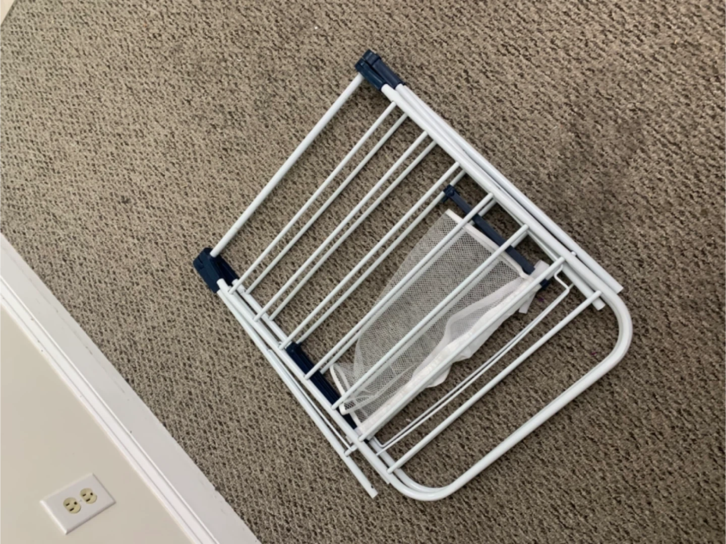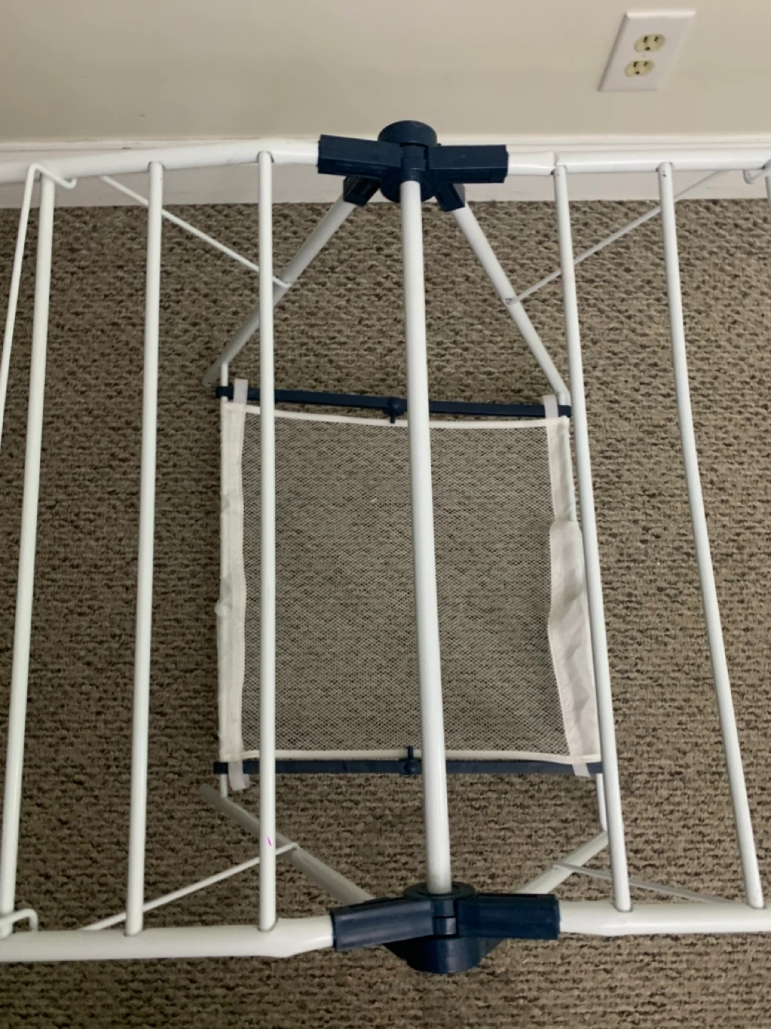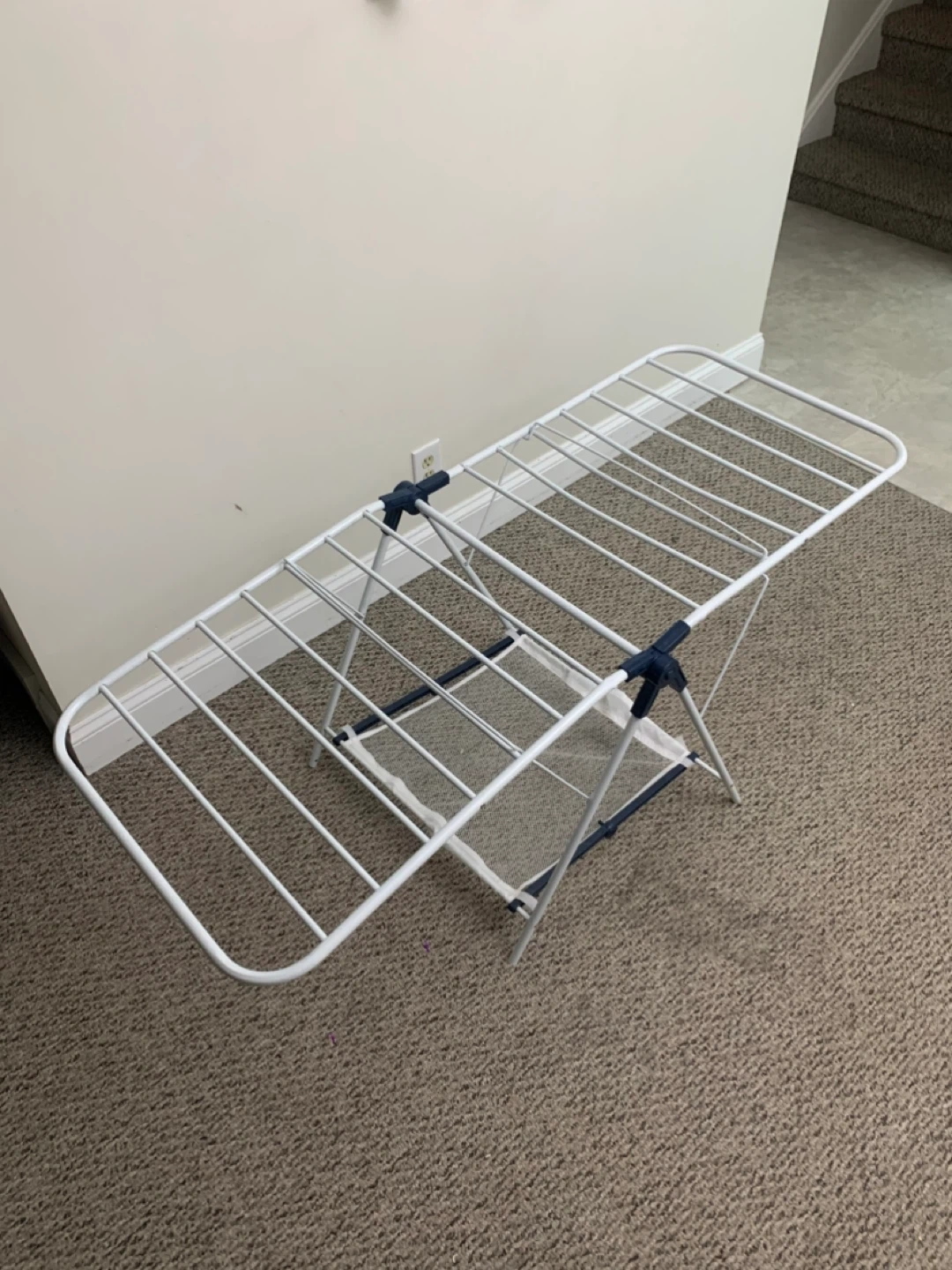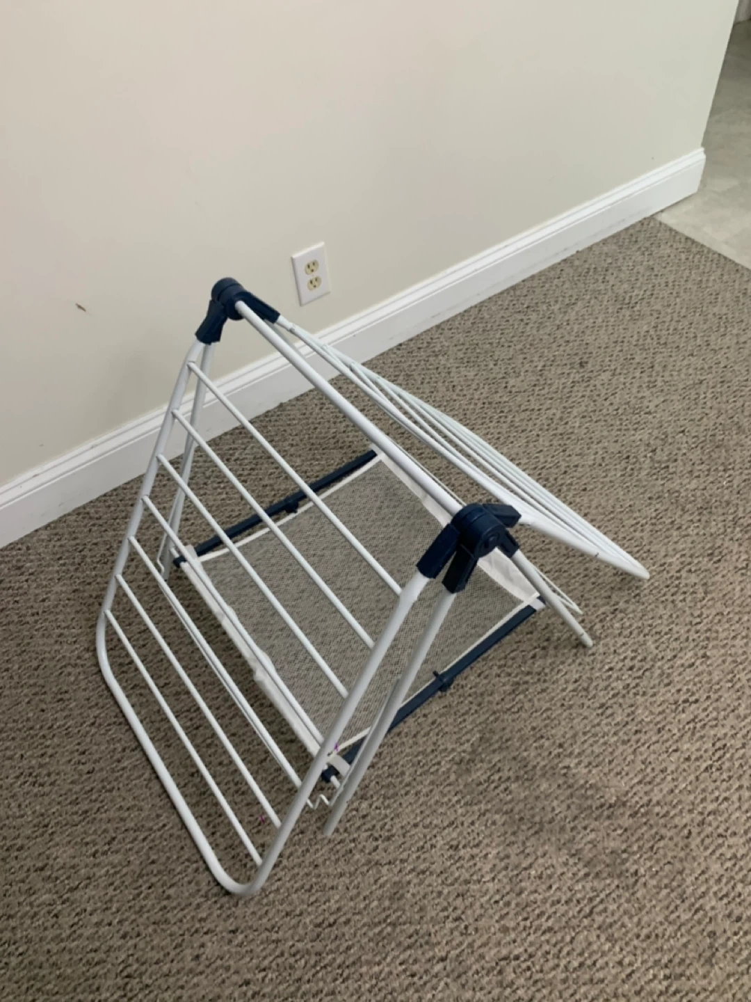 This is a white, folding drying rack for laundry. It's made of metal with blue plastic accents. It folds flat for easy storage.