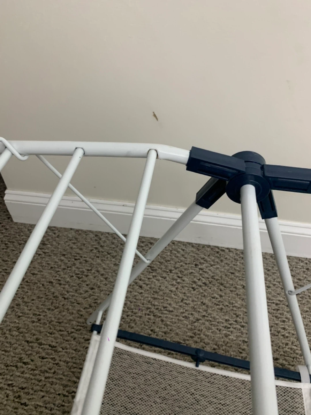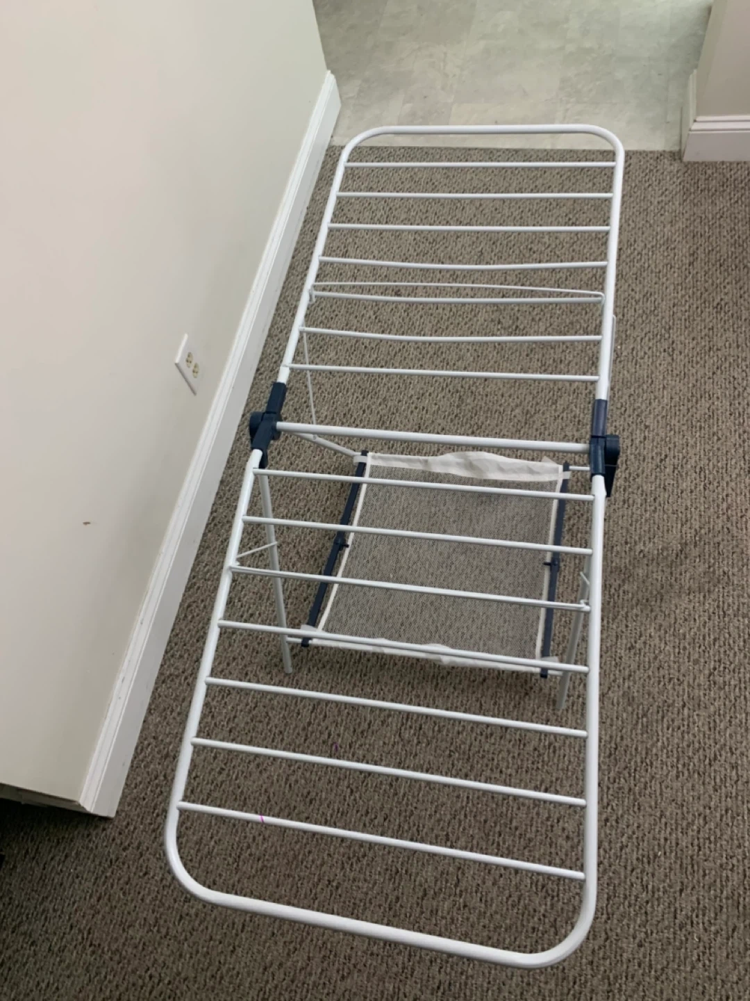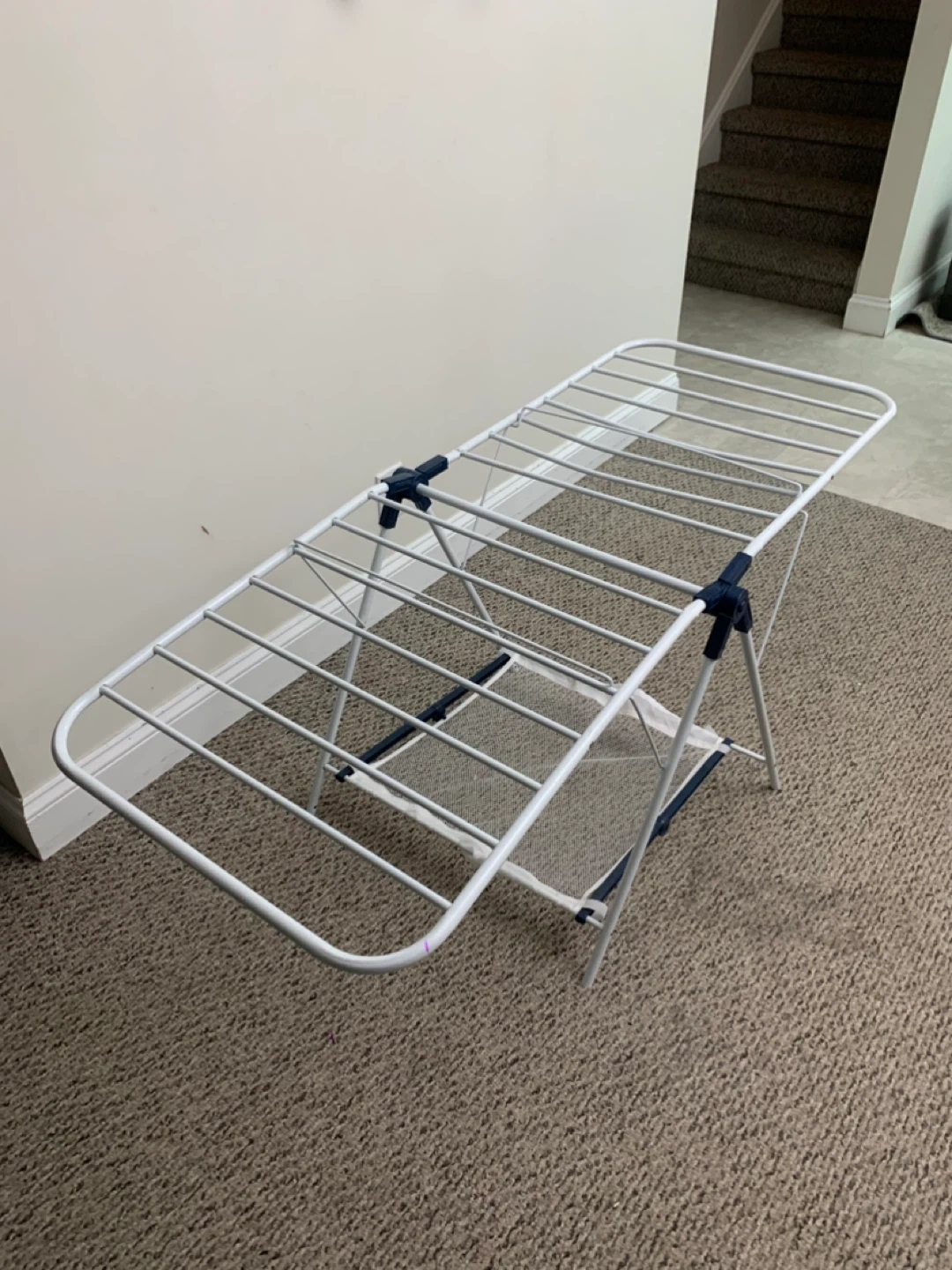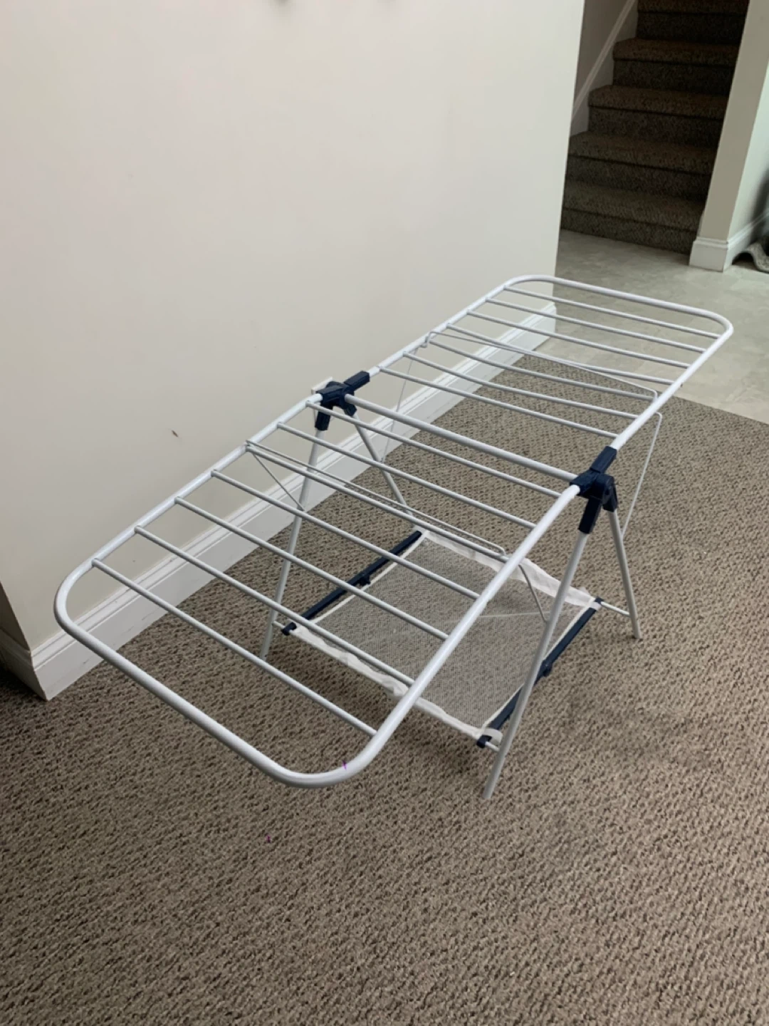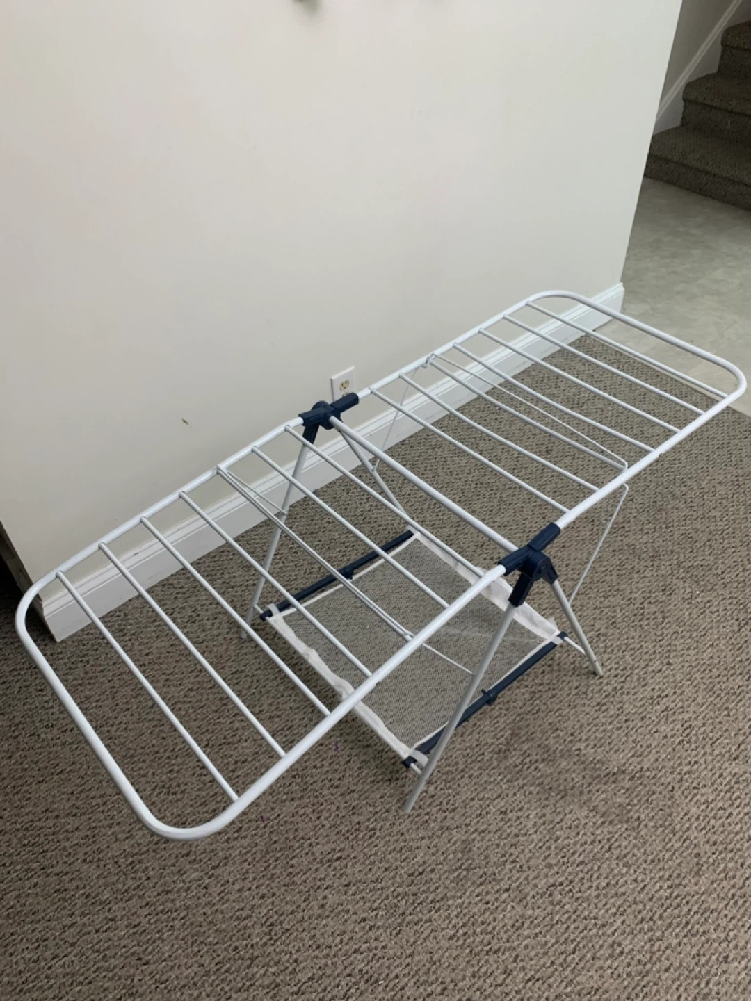 This is a white, folding drying rack for laundry. It's made of metal with blue plastic accents. It folds flat for easy storage.
