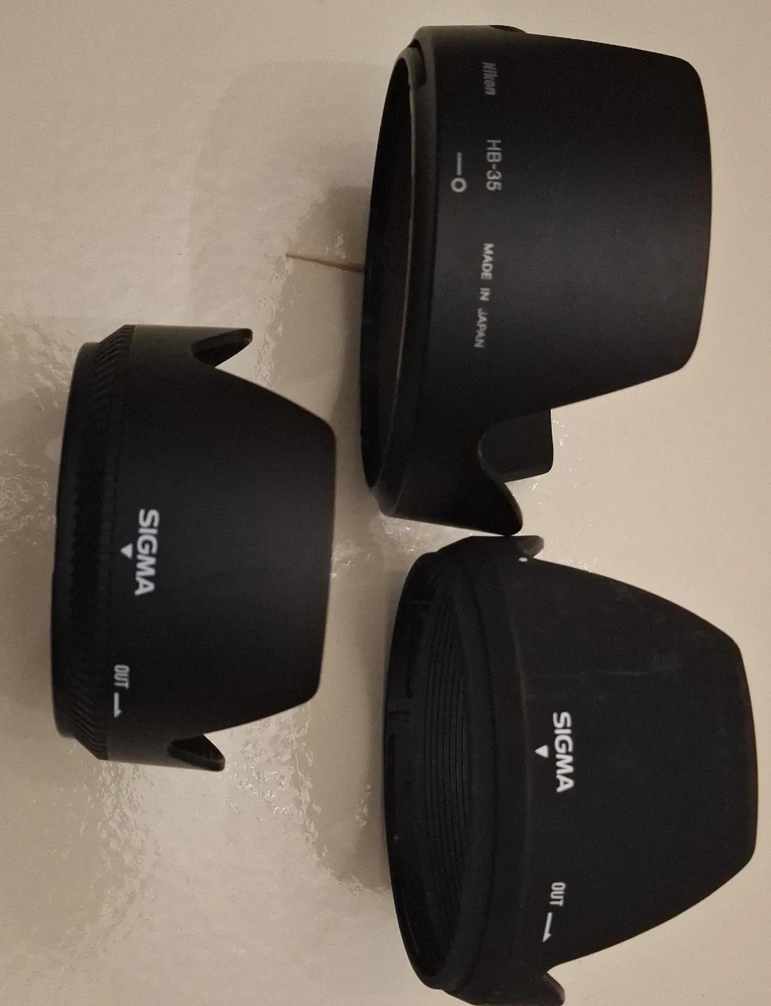 Three lens hoods: one Nikon HB-35 made in Japan, and two Sigma lens hoods. These protect camera lenses from stray light.