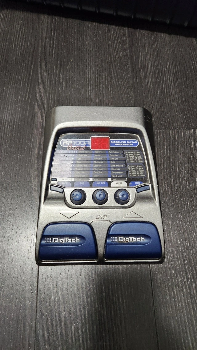 Looking to upgrade your guitar tone without breaking the bank? This DigiTech RP100A Artist modeling guitar processor is a solid all-in-one solution for practice, recording, or live use. It's in very good overall condition and fully functional, with normal cosmetic wear from use (see photos). Features include multiple amp models & cabinet simulations, built-in effects (chorus, delay, reverb, wah, distortion & more), an easy-to-use interface with onboard controls, and a drum machine for practice sessions. It has a compact and durable design. Connections: Input / Output, Control In (for expression pedal), and Power: 9V DC. Perfect for beginners or intermediate players who want a wide range of tones in one pedal. Cash accepted.