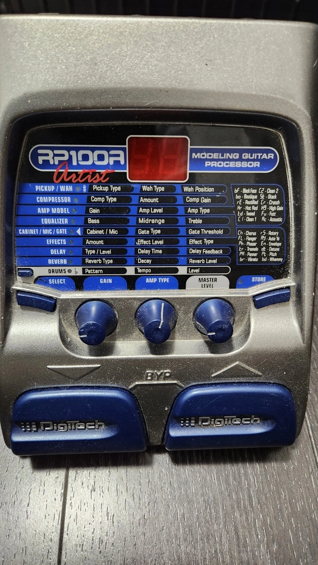 Looking to upgrade your guitar tone without breaking the bank? This DigiTech RP100A Artist modeling guitar processor is a solid all-in-one solution for practice, recording, or live use. It's in very good overall condition and fully functional, with normal cosmetic wear from use (see photos). Features include multiple amp models & cabinet simulations, built-in effects (chorus, delay, reverb, wah, distortion & more), an easy-to-use interface with onboard controls, and a drum machine for practice sessions. It has a compact and durable design. Connections: Input / Output, Control In (for expression pedal), and Power: 9V DC. Perfect for beginners or intermediate players who want a wide range of tones in one pedal. Cash accepted.