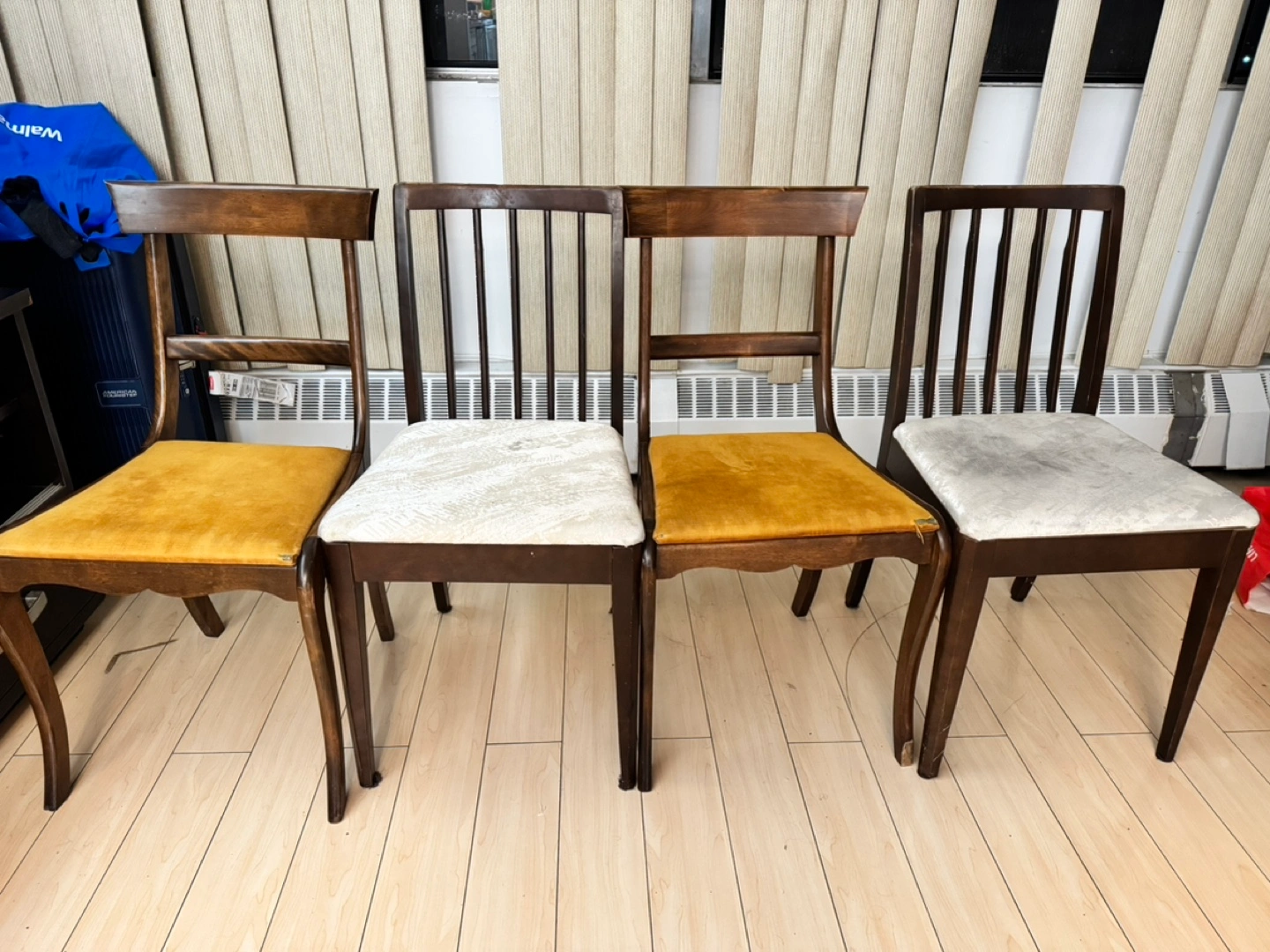 Four vintage dining chairs. Dark brown wood. Two chairs have mustard yellow cushions, two have off-white cushions. Some wear and tear visible. Great for a dining room or kitchen.