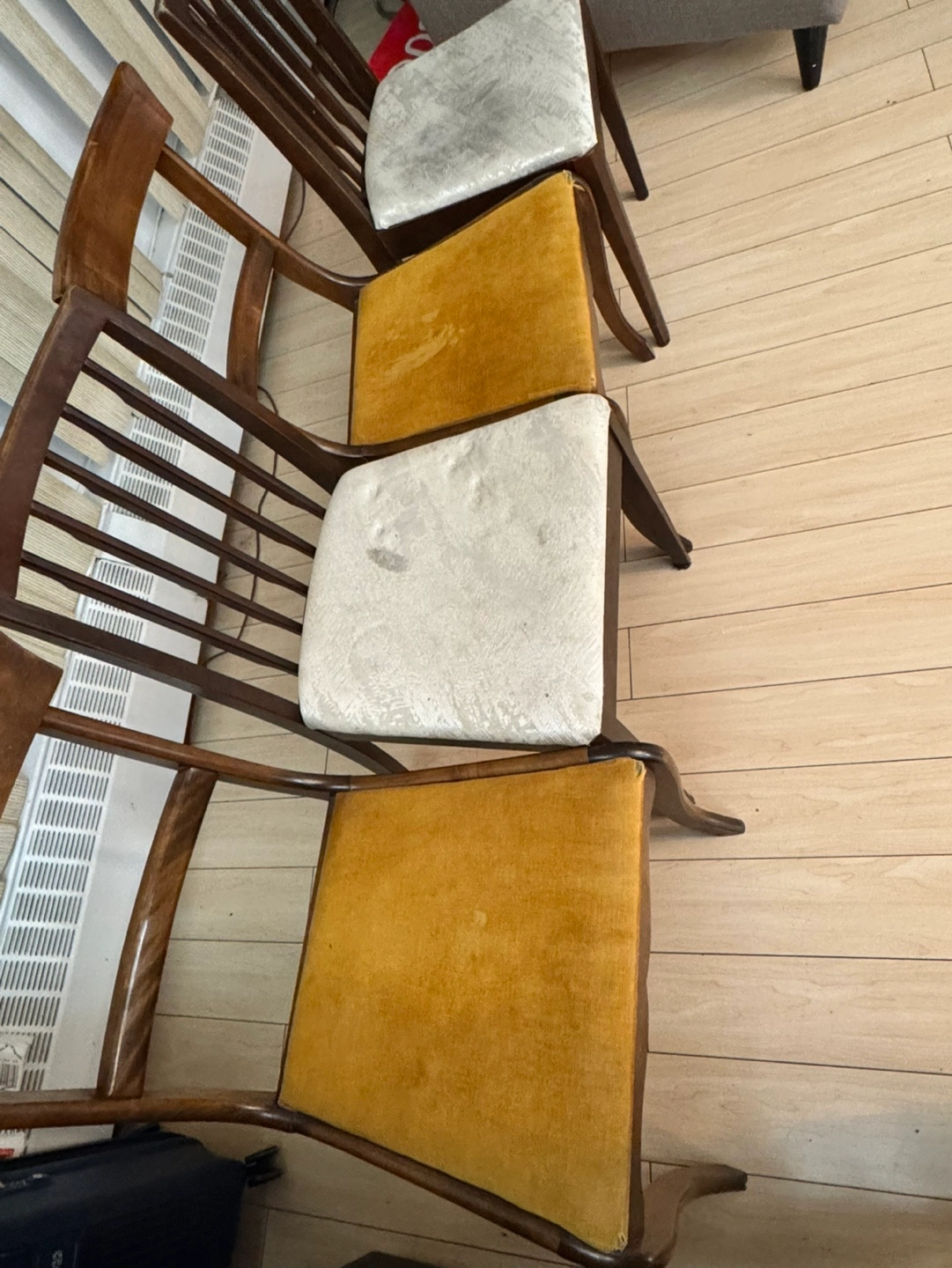Four vintage dining chairs. Dark brown wood. Two chairs have mustard yellow cushions, two have off-white cushions. Some wear and tear visible. Great for a dining room or kitchen.