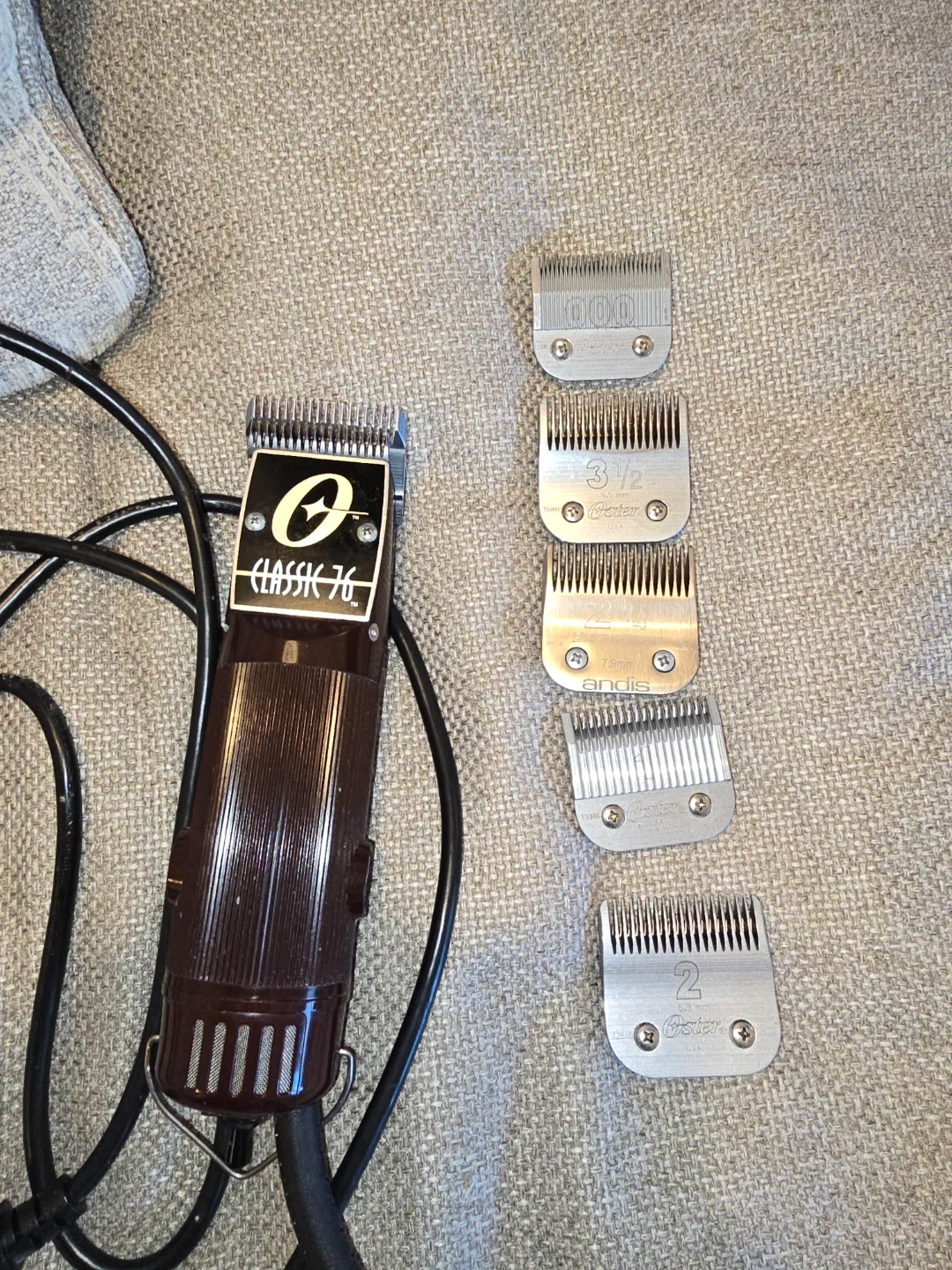 Oster Classic 76 hair clipper with a maroon body. It comes with seven detachable blades in various sizes. Also includes 10 guards. This is a professional grade clipper for haircuts.