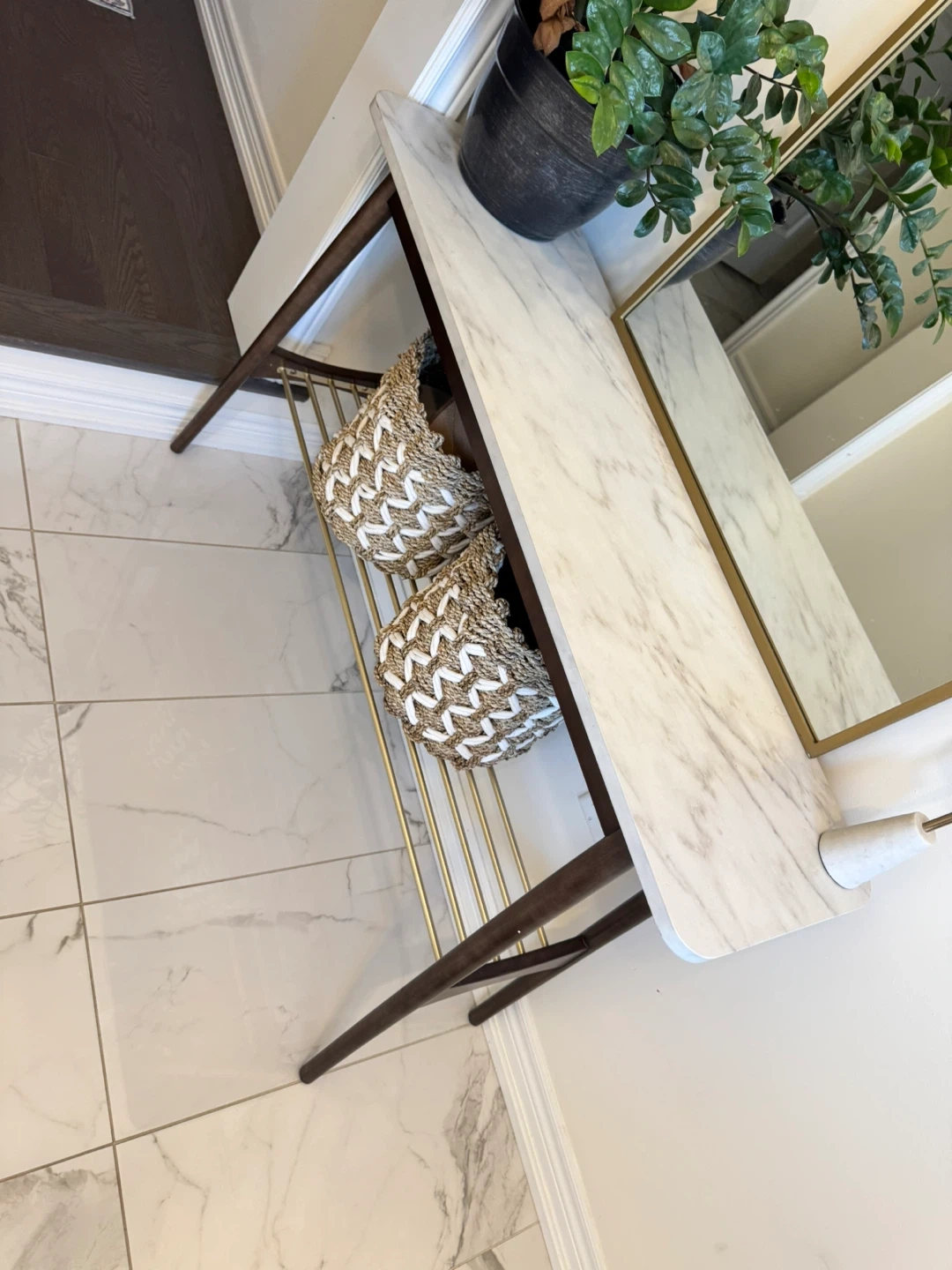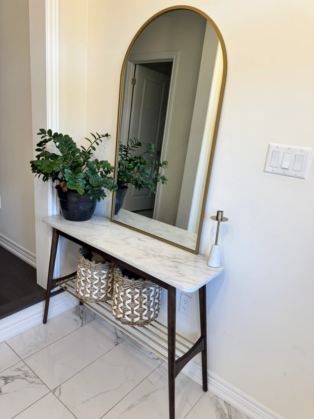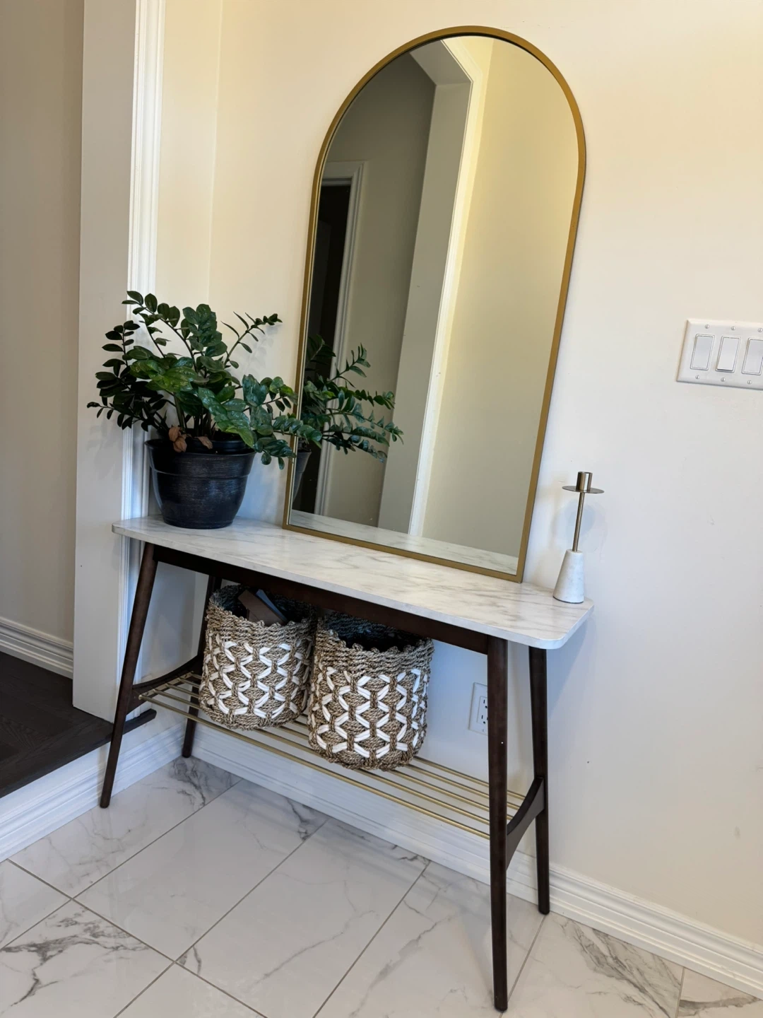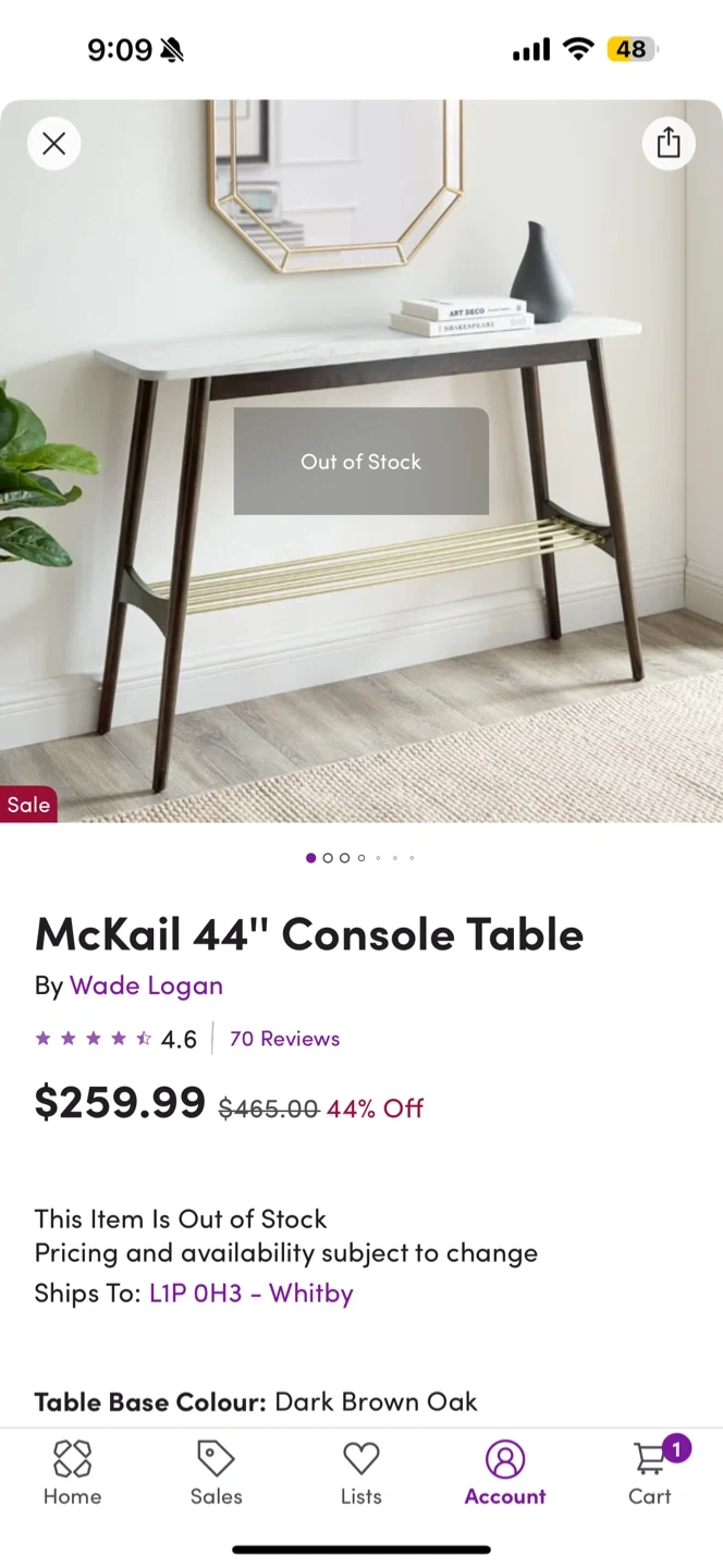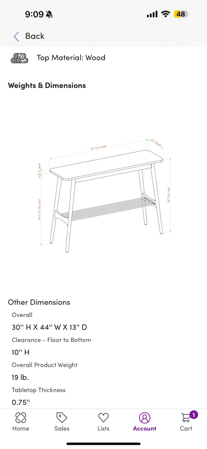 Selling a McKail 44" console table! It's in great shape and would look lovely in an entryway or living room. Here are the dimensions: - Overall: 30" H x 44" W x 13" D - Clearance - Floor to Bottom: 10" - Tabletop Thickness: 0.75" - Table Base Colour: Dark Brown Oak - Top Material: Wood