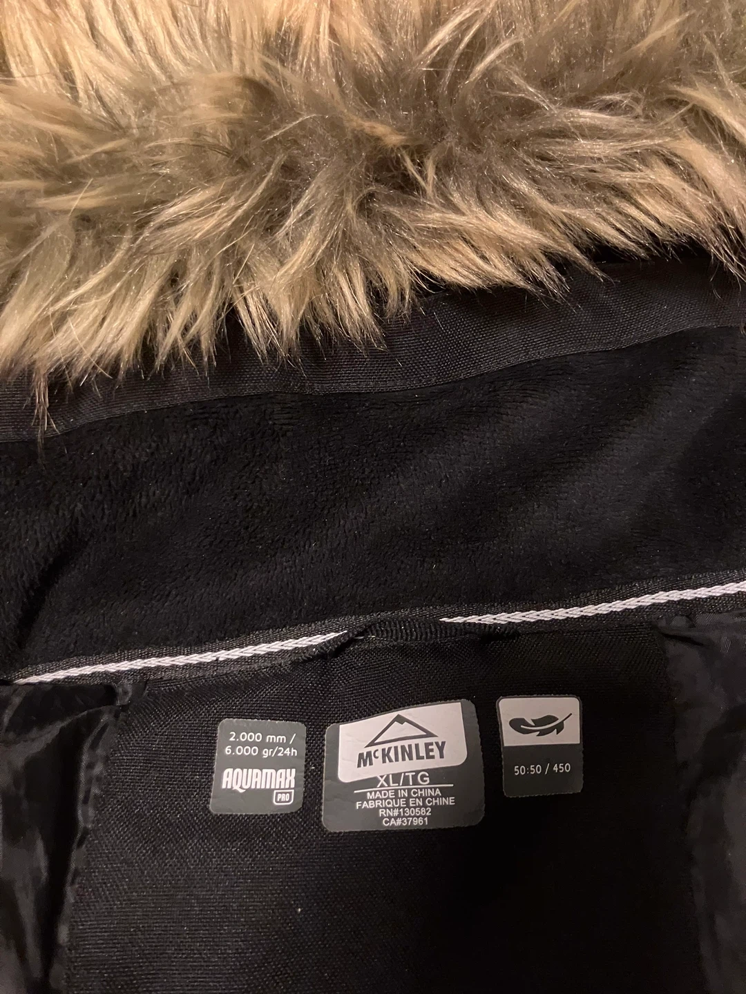 60Selling a gently used McKinley winter jacket in size women’s XL. It's a light weight but very warm jacket, double cuffs, faux fur lined removable hood, cinch able waist. Worn past the hips. Retails over $200.