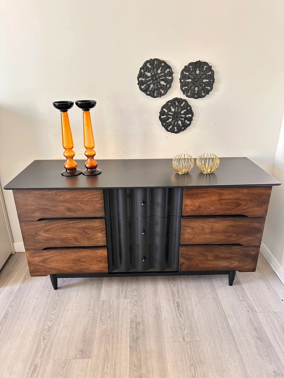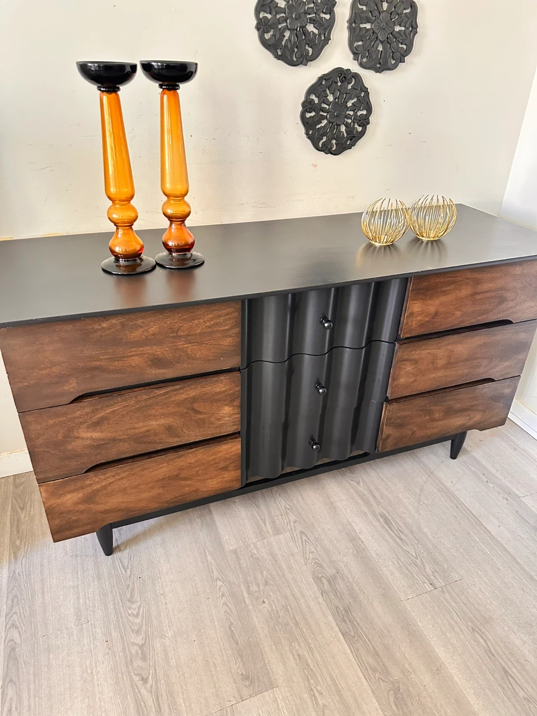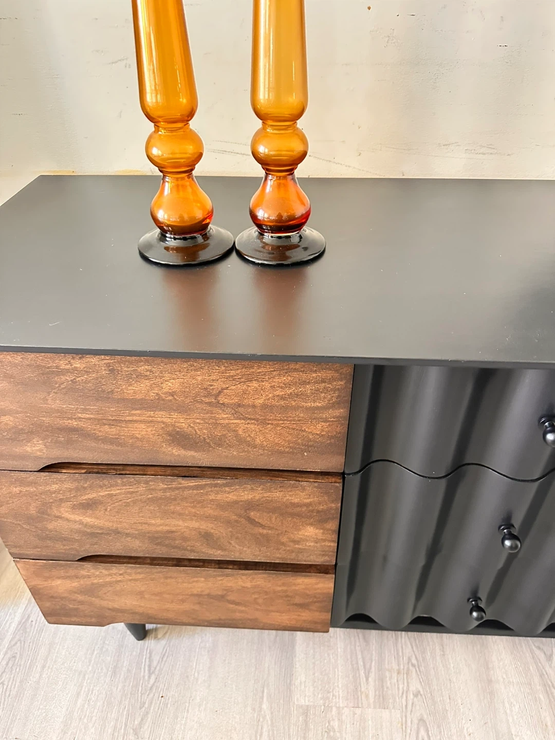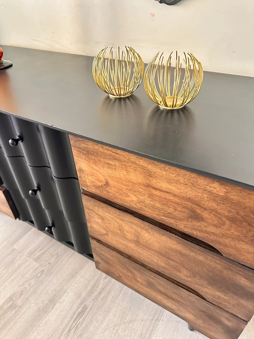 10Here’s a dresser with a unique design! It features a combination of wood and black accents, offering a stylish look for any bedroom. The dresser has multiple drawers, providing ample storage space for your clothes and belongings. It’s in great condition and ready to find a new home!