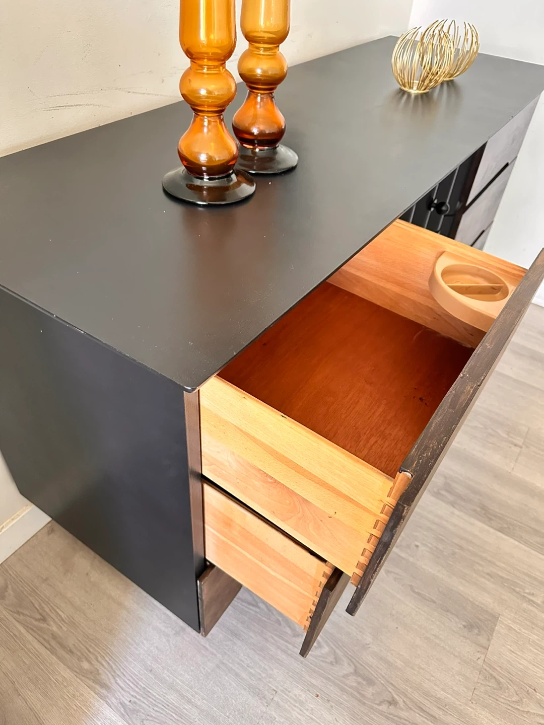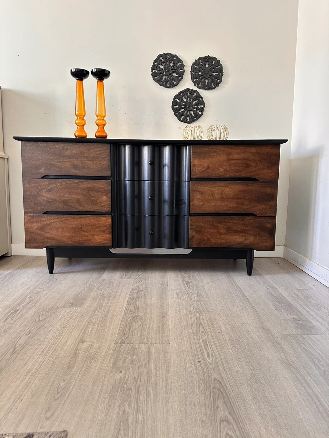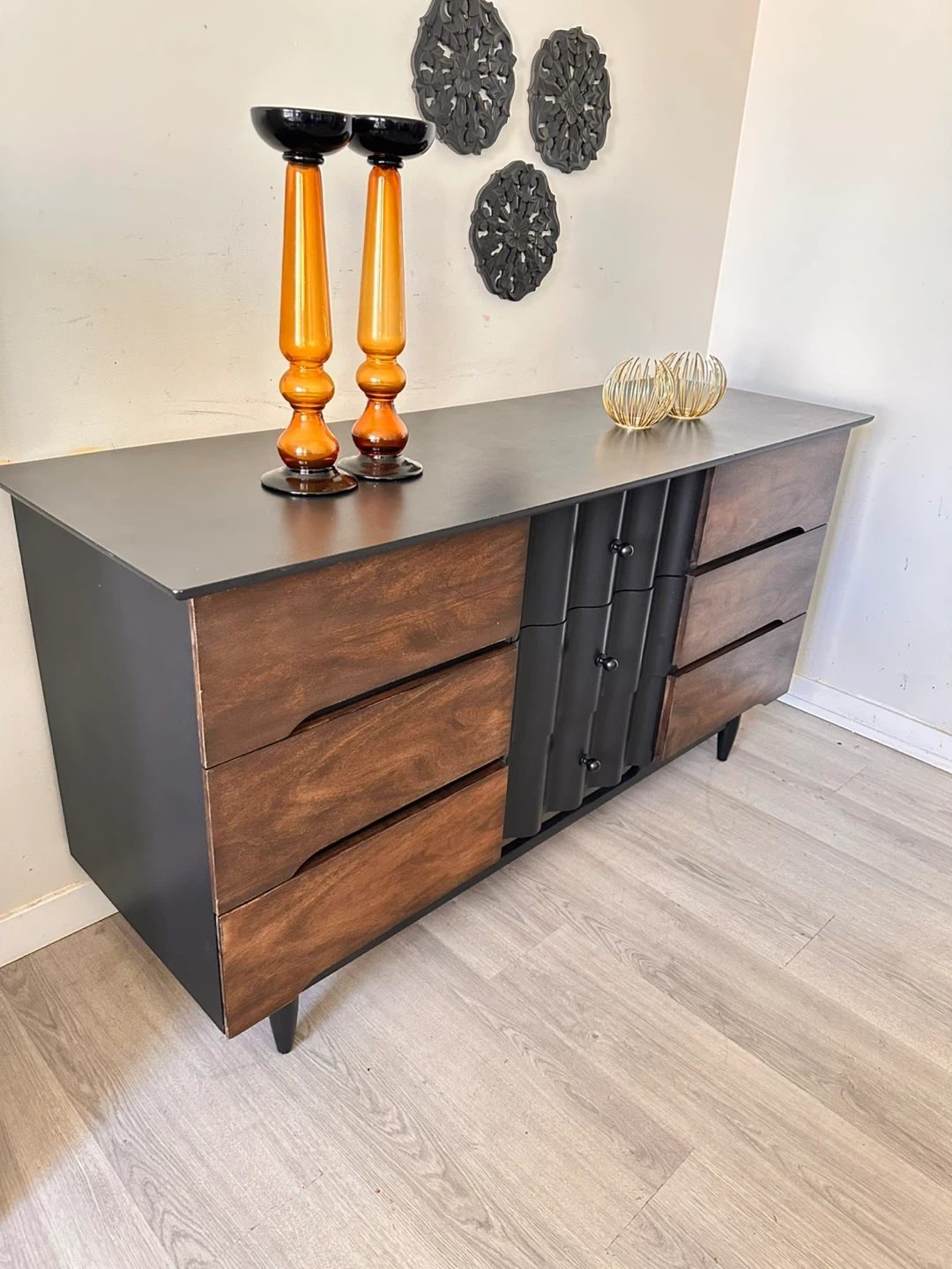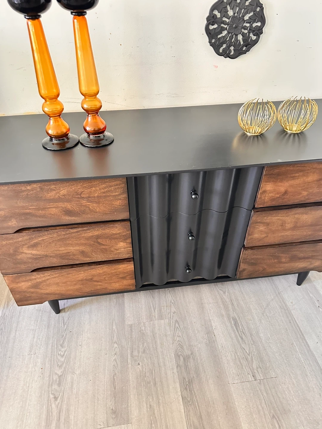 10Here’s a dresser with a unique design! It features a combination of wood and black accents, offering a stylish look for any bedroom. The dresser has multiple drawers, providing ample storage space for your clothes and belongings. It’s in great condition and ready to find a new home!