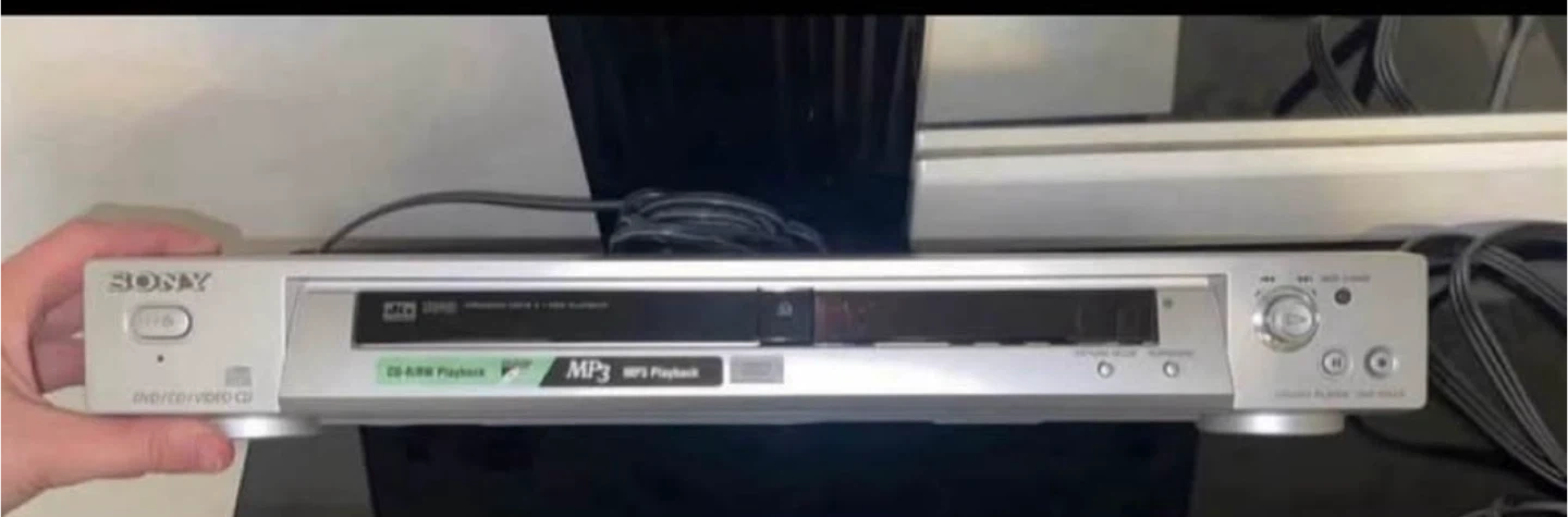 This is a silver Sony DVD player that supports MP3 playback. It includes RCA cables for connection. A great addition to your home entertainment setup!