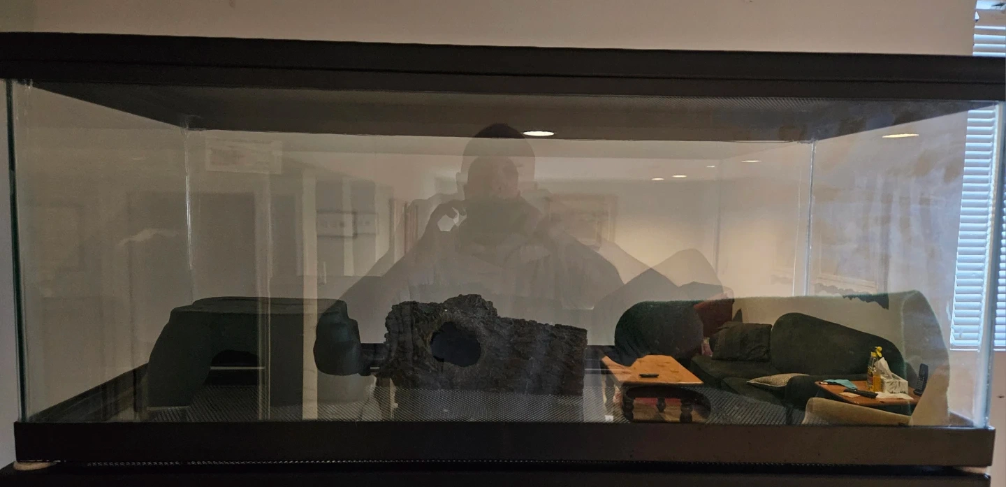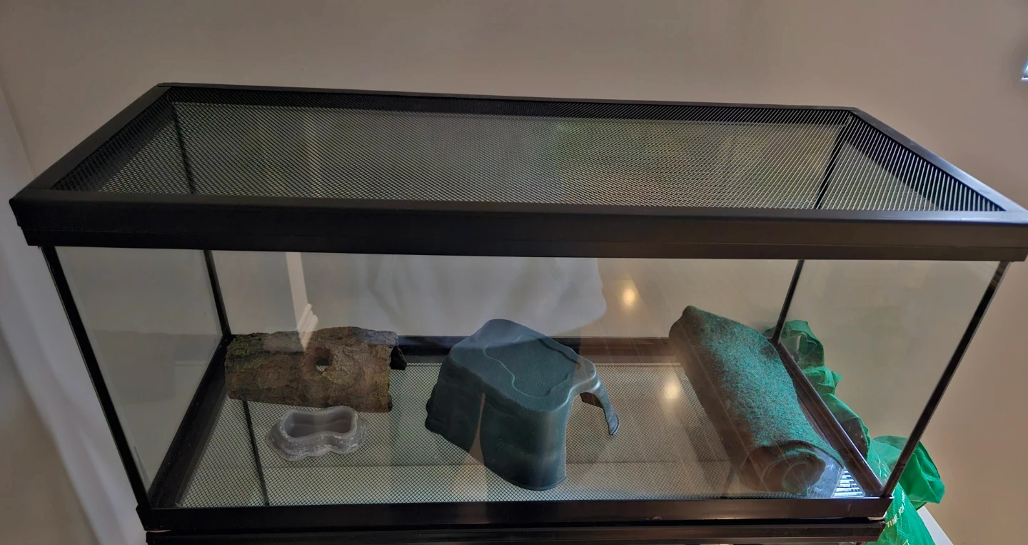 This is a spacious glass terrarium. It includes a metal mesh lid for ventilation. Comes with a water dish, a hide, and a textured mat. It's great for small reptiles or amphibians!