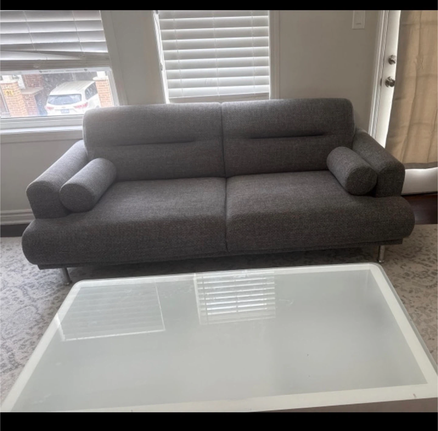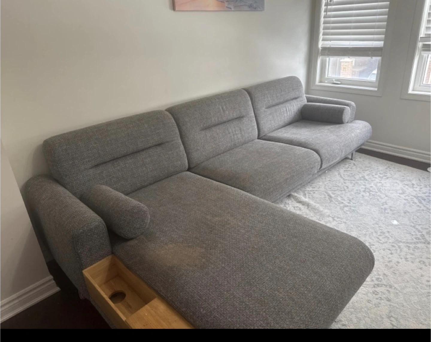 This grey sectional sofa offers comfortable seating and a chaise for extra lounging. It's upholstered in a durable fabric and features a modern design. Storage is available under the chaise.