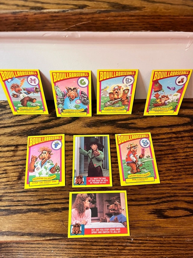 Hey there, card collectors! I'm parting ways with my vintage collection of 1988 Topps Bouilla Baseball cards featuring the hilarious ALF. These showcase the wacky designs and characters from the popular TV show. They're a great addition to any collection or a fun nostalgic trip. If you're keen on owning a piece of 80s memorabilia, these cards are just the ticket. Check out my other listings for more cool stuff!