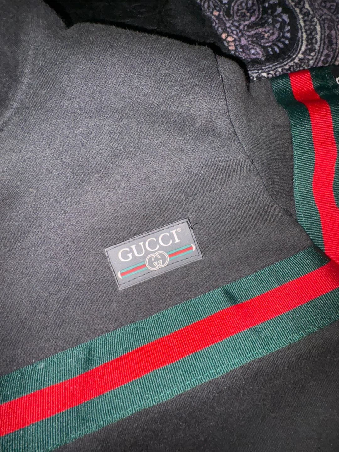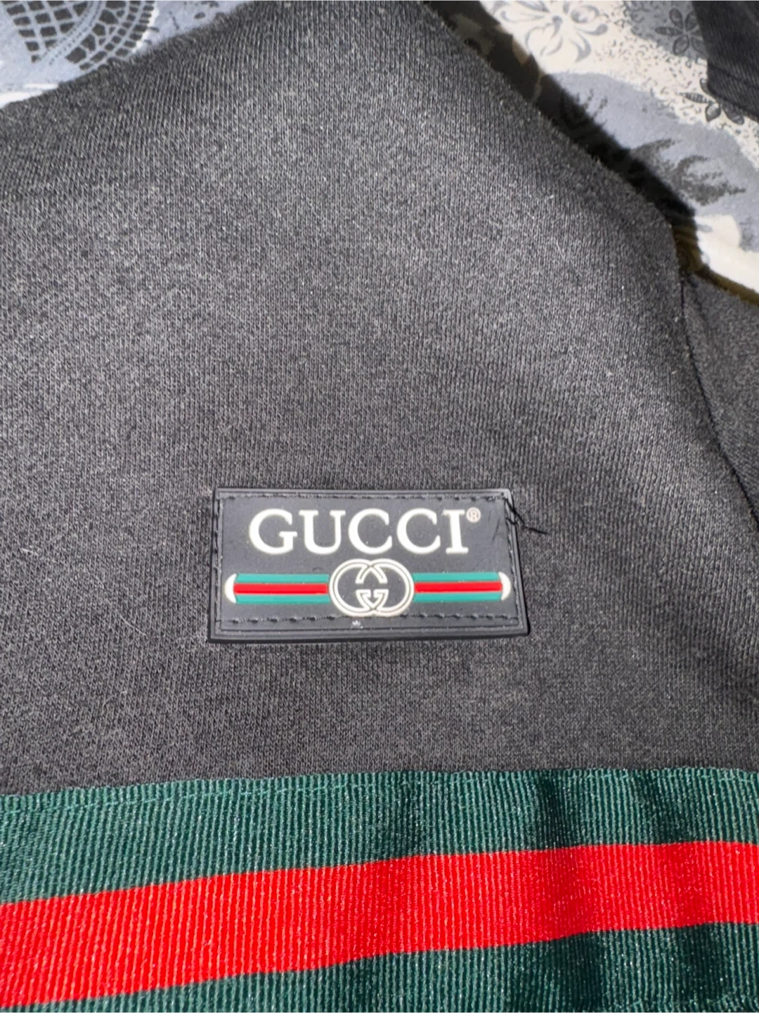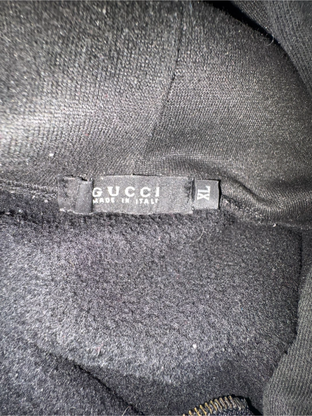 Selling a Gucci black zip-up hoodie in size XL. It has the signature Gucci pattern on the sleeves and pocket, with red and green stripes. Made in Italy