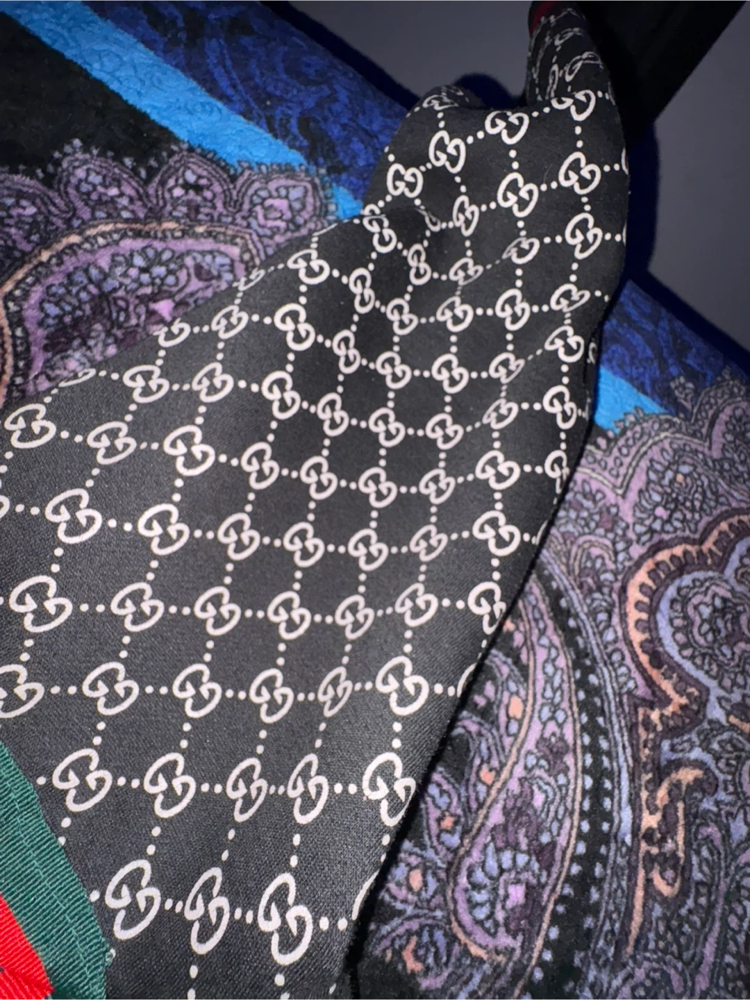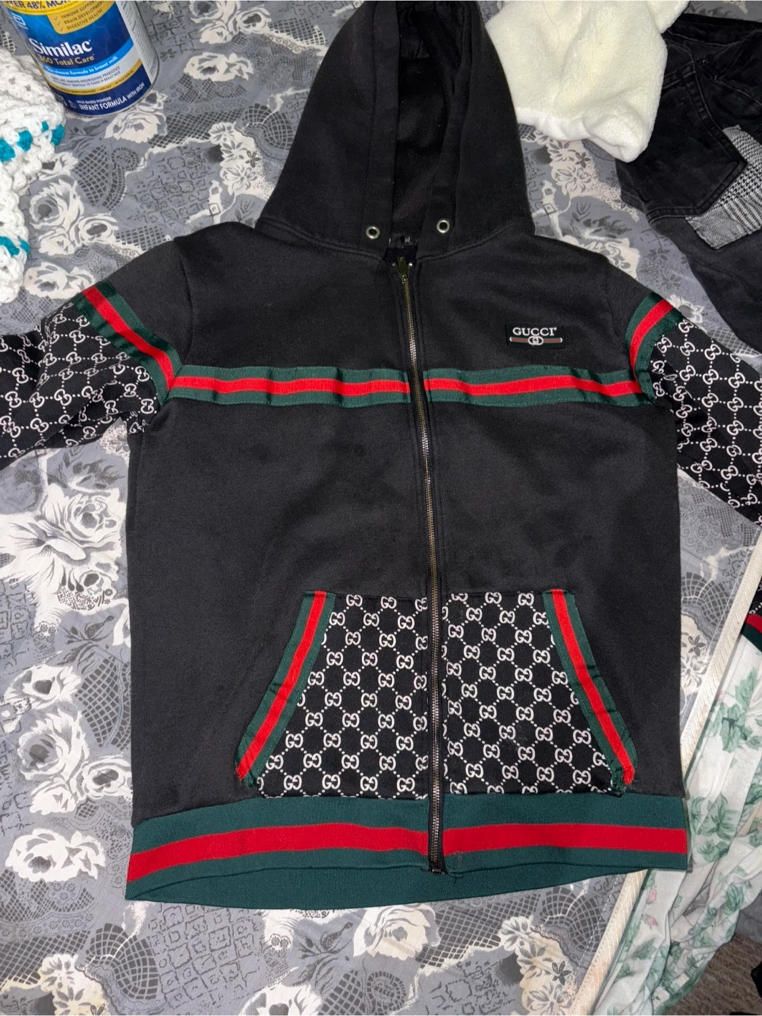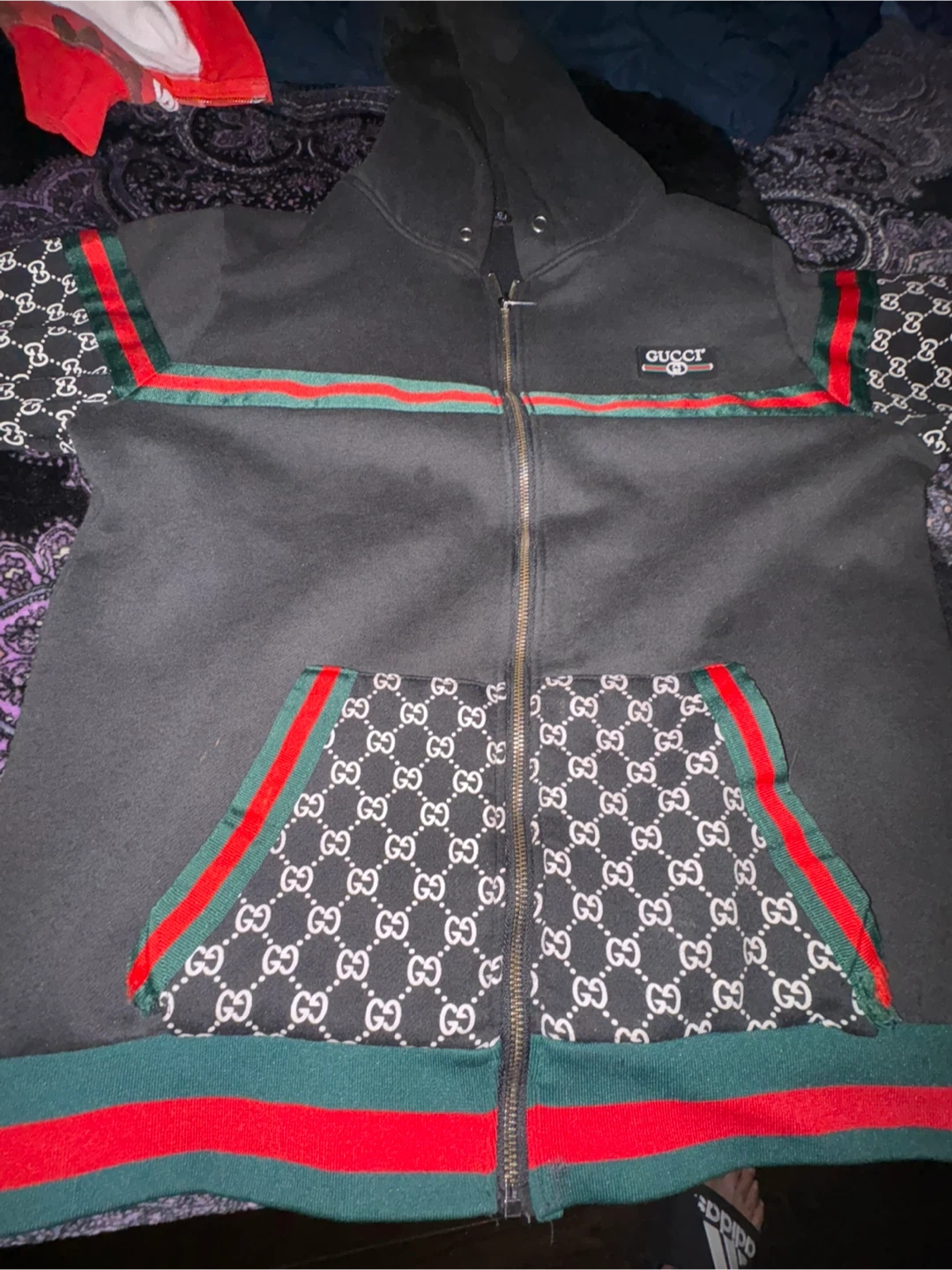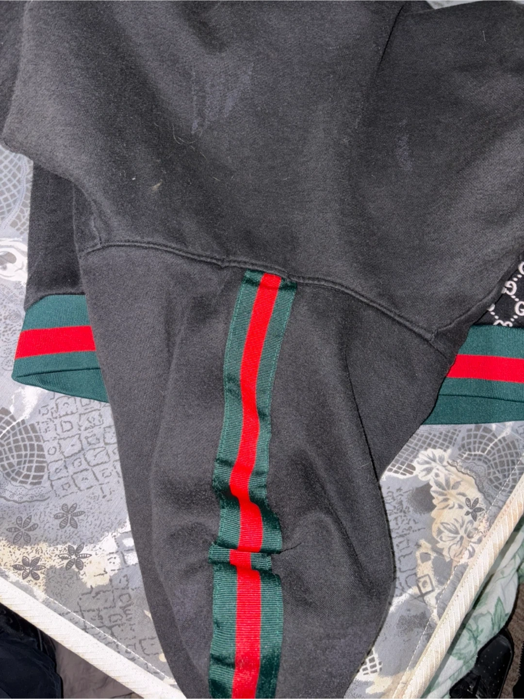 Selling a Gucci black zip-up hoodie in size XL. It has the signature Gucci pattern on the sleeves and pocket, with red and green stripes. Made in Italy
