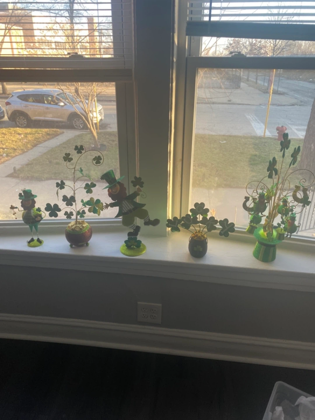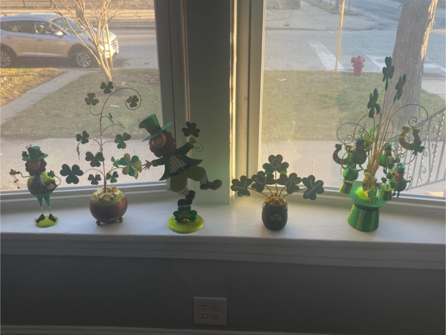 This set includes five festive St. Patrick's Day decorations featuring leprechauns and shamrocks. They're designed to add a touch of Irish cheer to your home. These charming pieces are perfect for displaying on a windowsill or mantelpiece to celebrate the holiday!