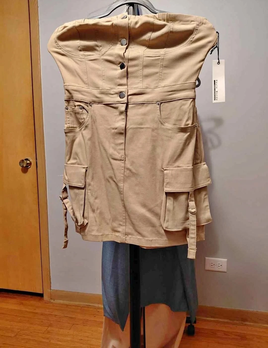 This is a cute tan mini dress from Haute Monde! It features a strapless design with button details and cargo pockets. Great for a casual day out or a fun night with friends