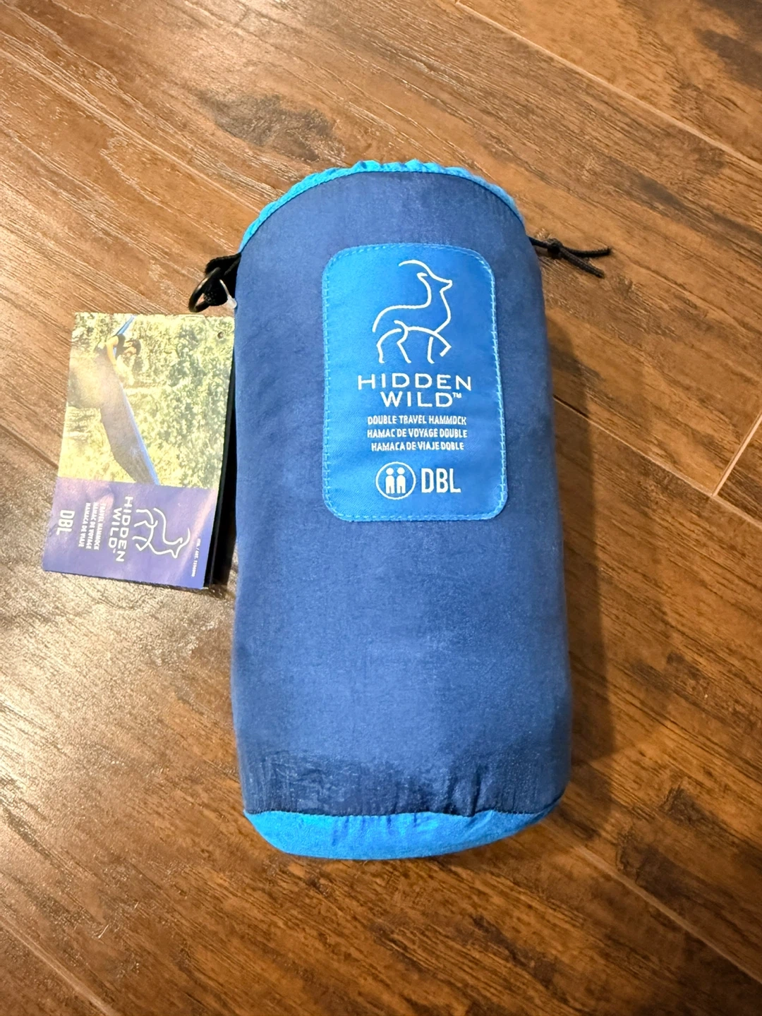This is a Hidden Wild double travel hammock. It's a blue, portable hammock designed for two people. Includes the stuff sack for easy storage and transport.