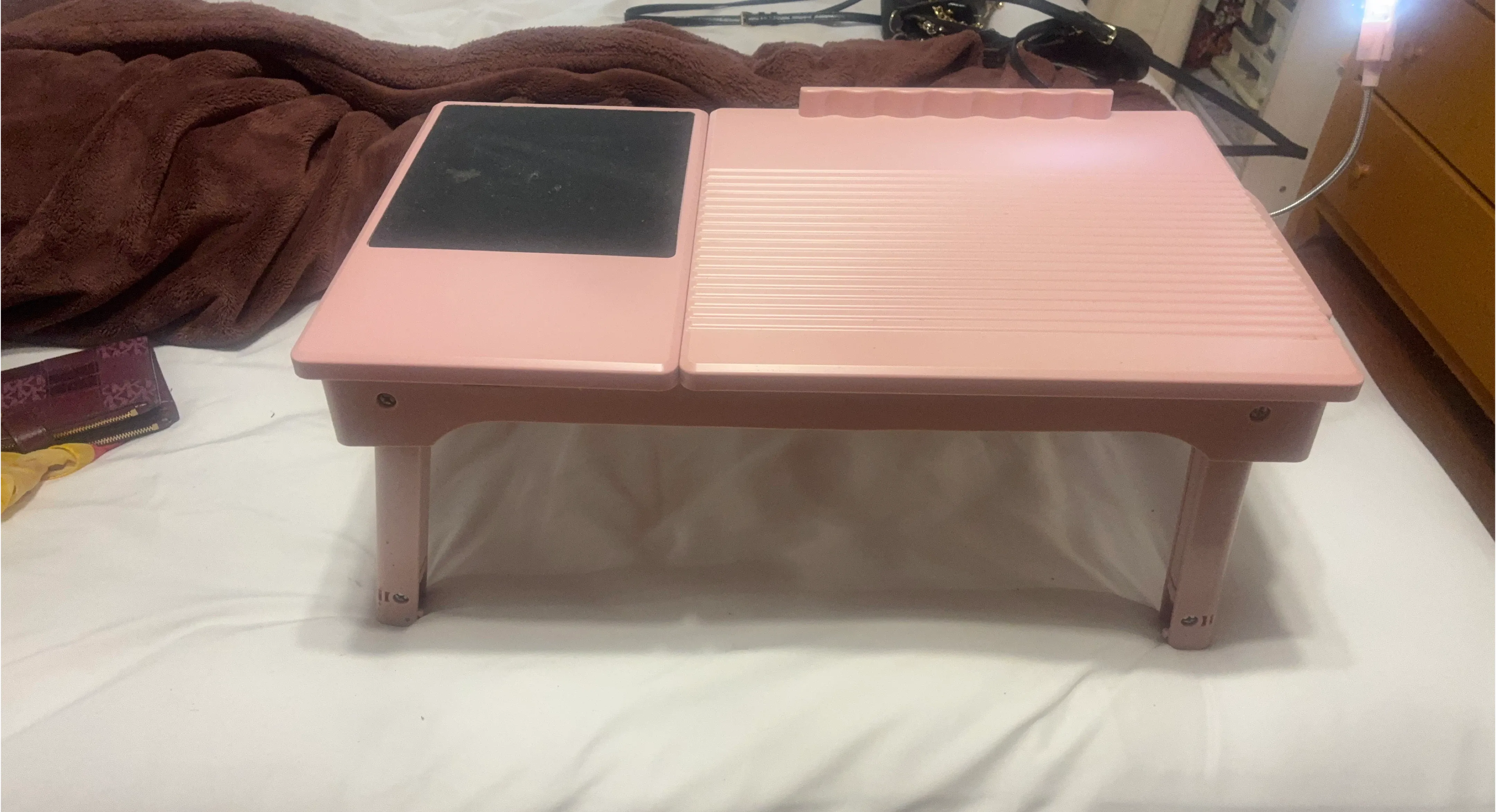 Selling a cute pink lap desk! It's in good condition and perfect for working or relaxing in bed or on the couch. It has a smooth surface and foldable legs for easy storage