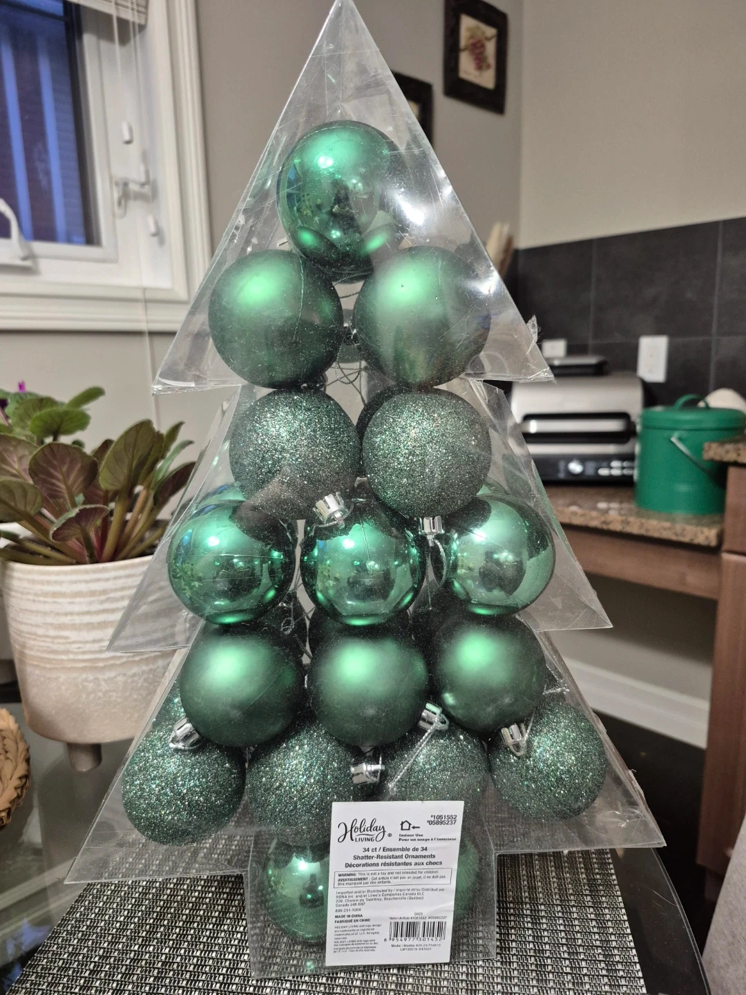 Holiday Living set of 34 shatter-resistant ornaments. Comes in a green colour with a mix of matte and glitter finishes. Indoor use. Green. New never used.