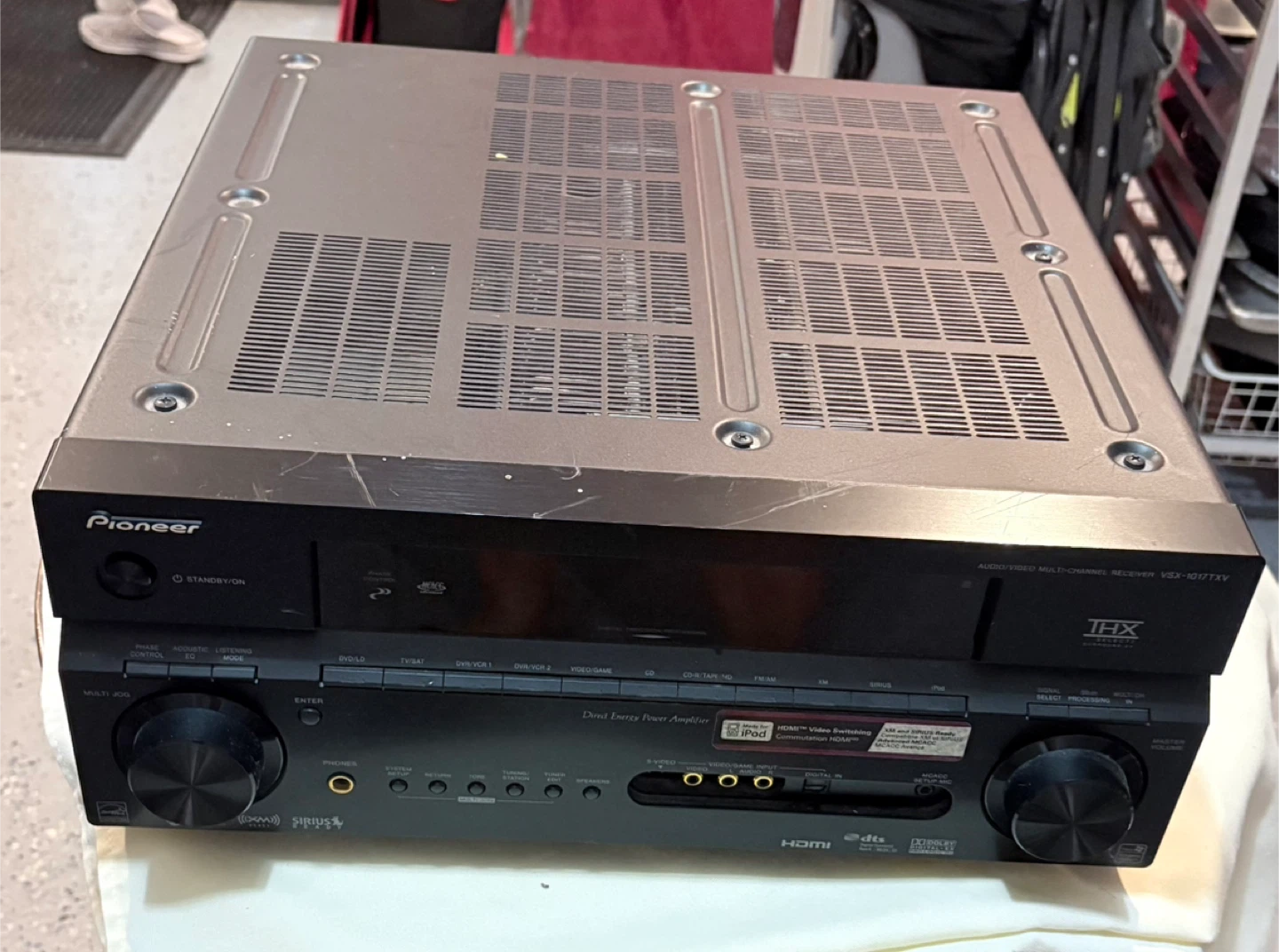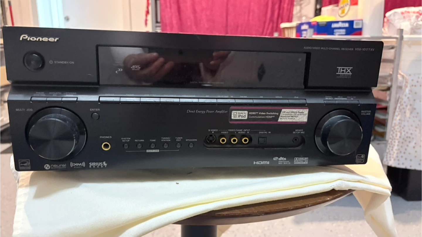 Pioneer Audio/Video Multi-Channel Receiver, model VSX-1017AV-K. It's a black, Direct Energy Power Amplifier. This receiver supports surround sound and multiple inputs like HDMI and optical. Great for setting up a home theatre system!