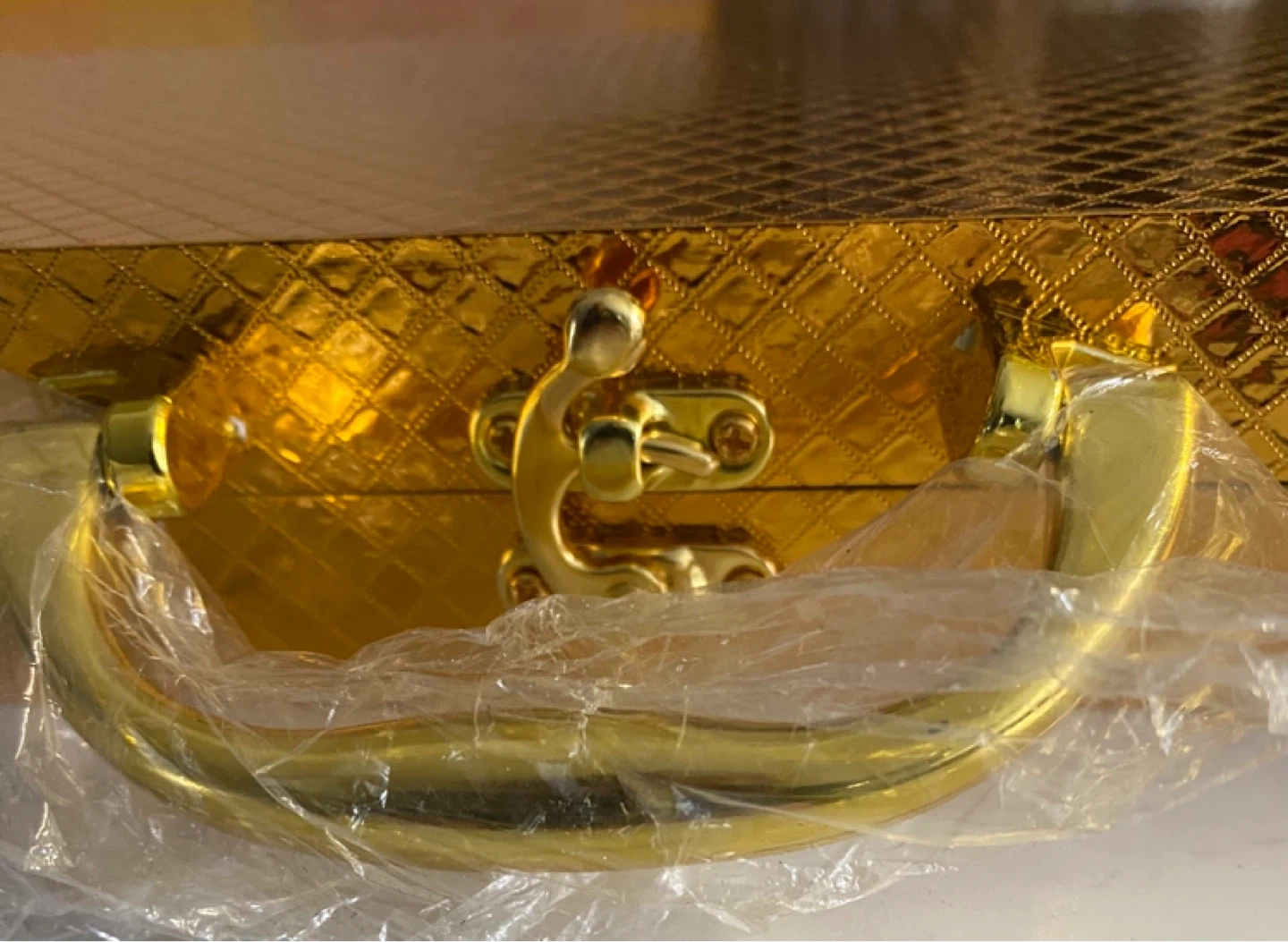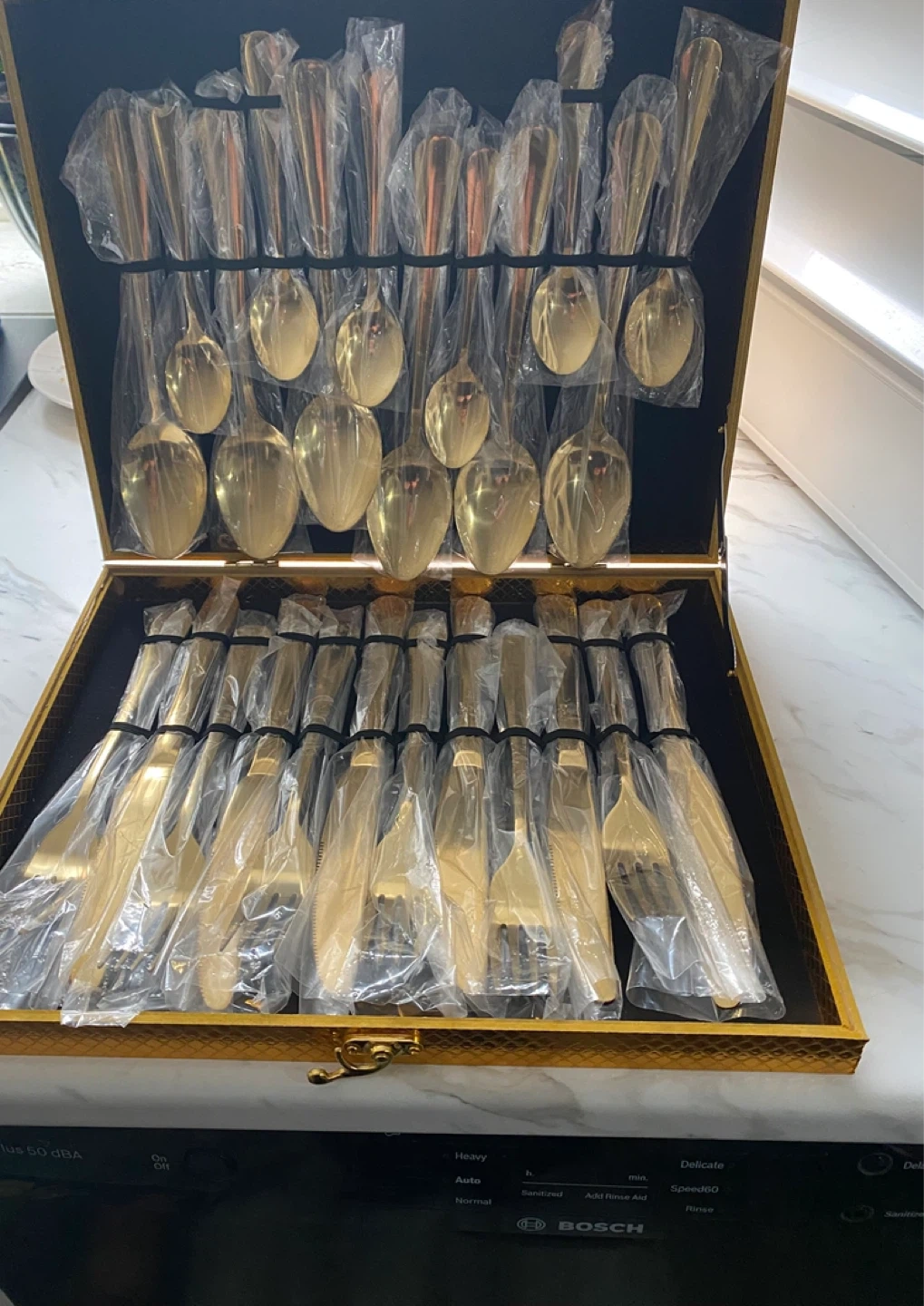 A complete set of six gold-coloured cutlery, including knives, forks, and spoons, all housed in a decorative carrying case. The case measures 13" by 9.8". This elegant set is ready for your next special occasion! Never used