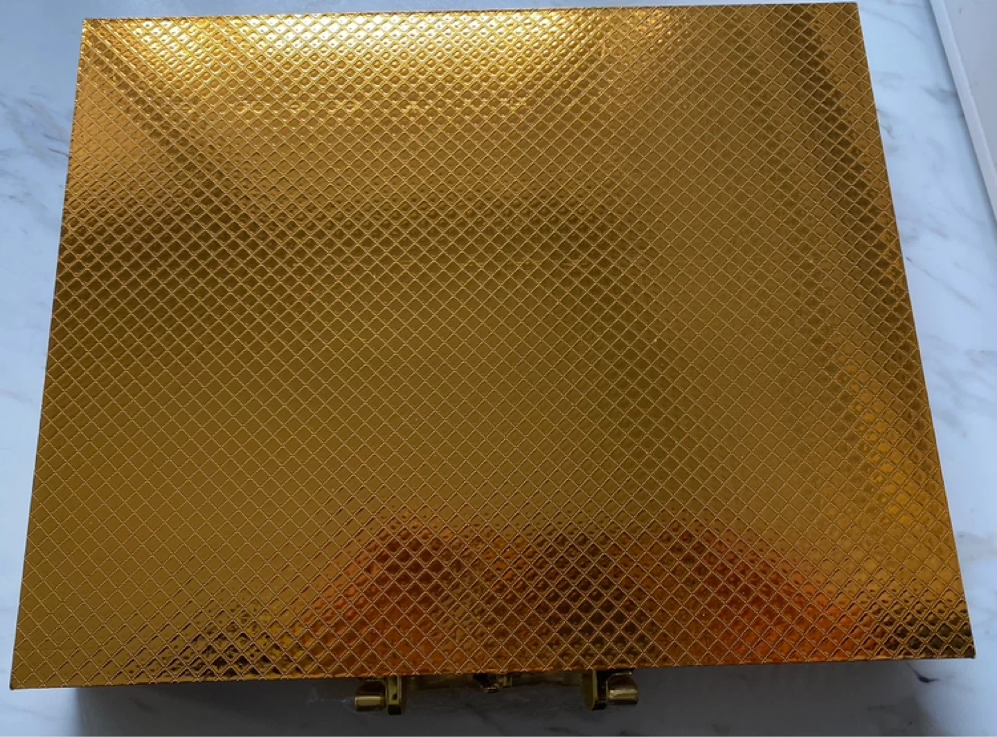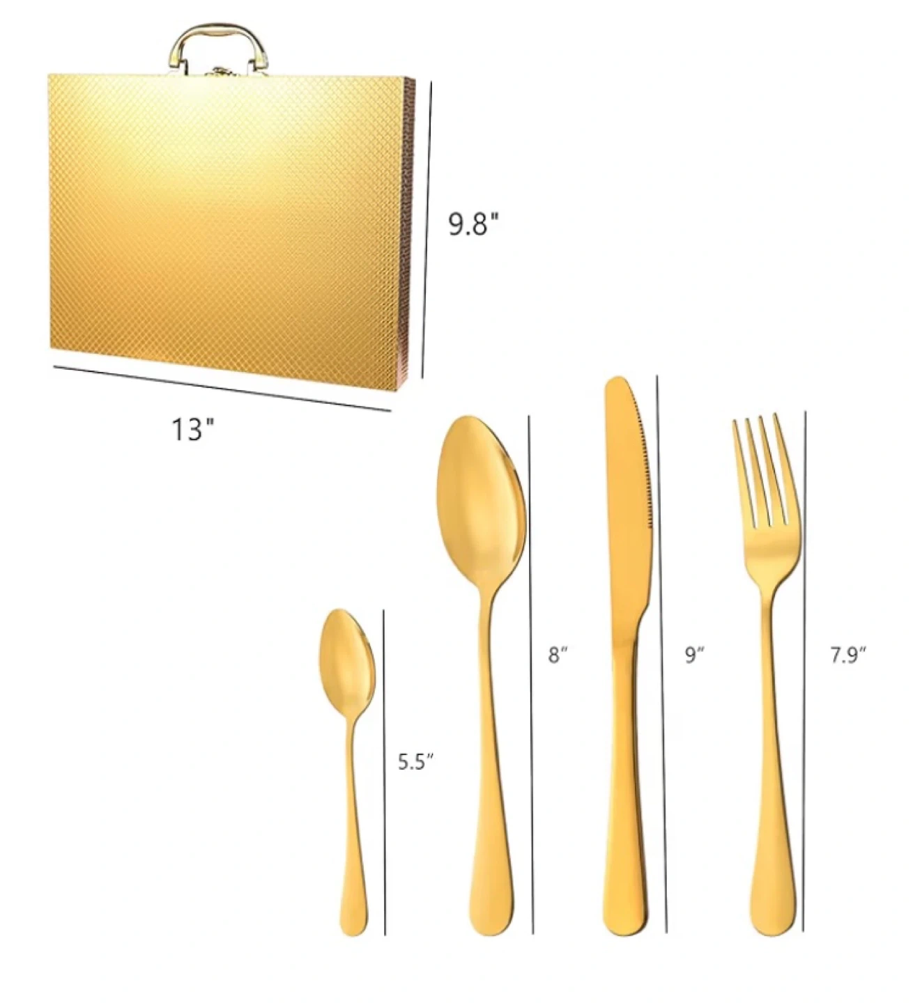 A complete set of six gold-coloured cutlery, including knives, forks, and spoons, all housed in a decorative carrying case. The case measures 13" by 9.8". This elegant set is ready for your next special occasion! Never used