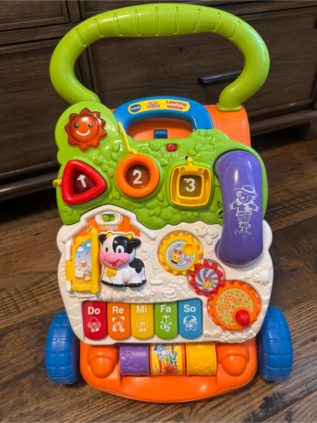 This VTech Sit-to-Stand Learning Walker helps babies learn and play. It's loaded with activities like a piano, gears, and musical notes. It's great for little ones learning to stand and walk!
