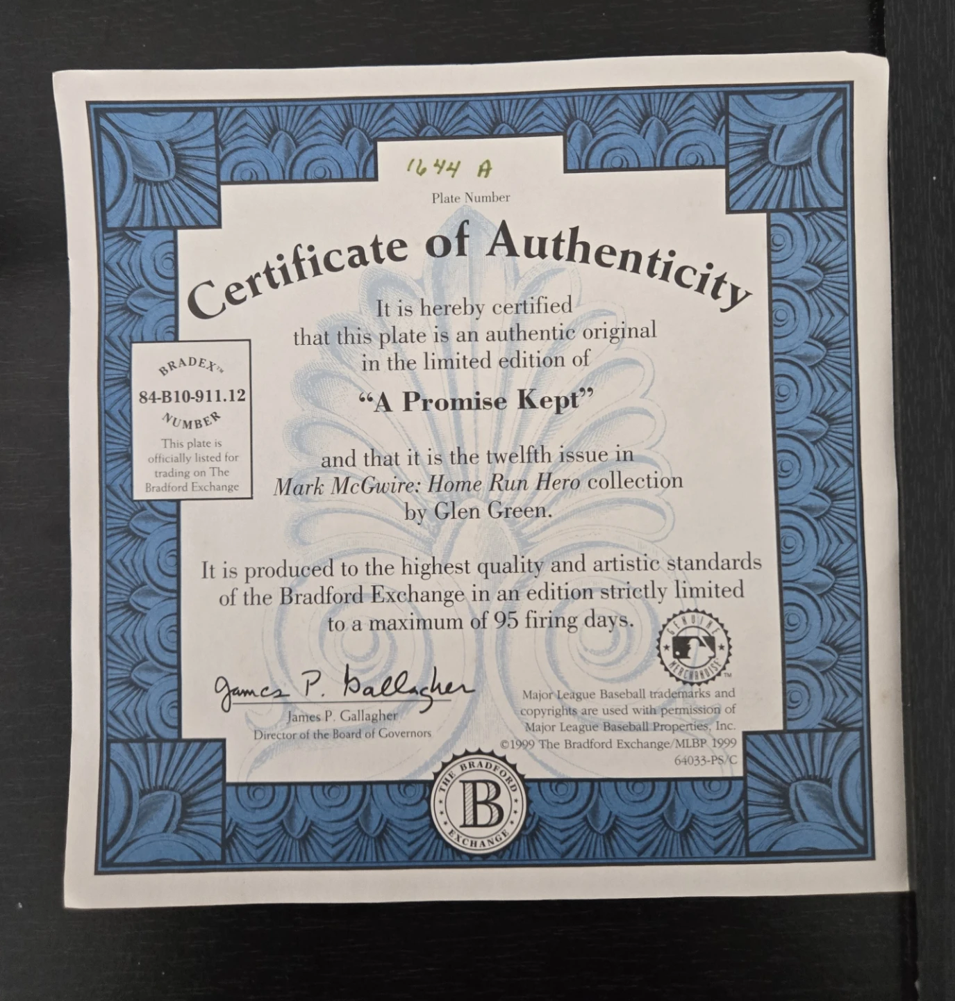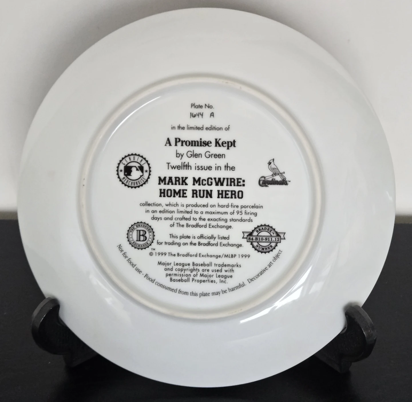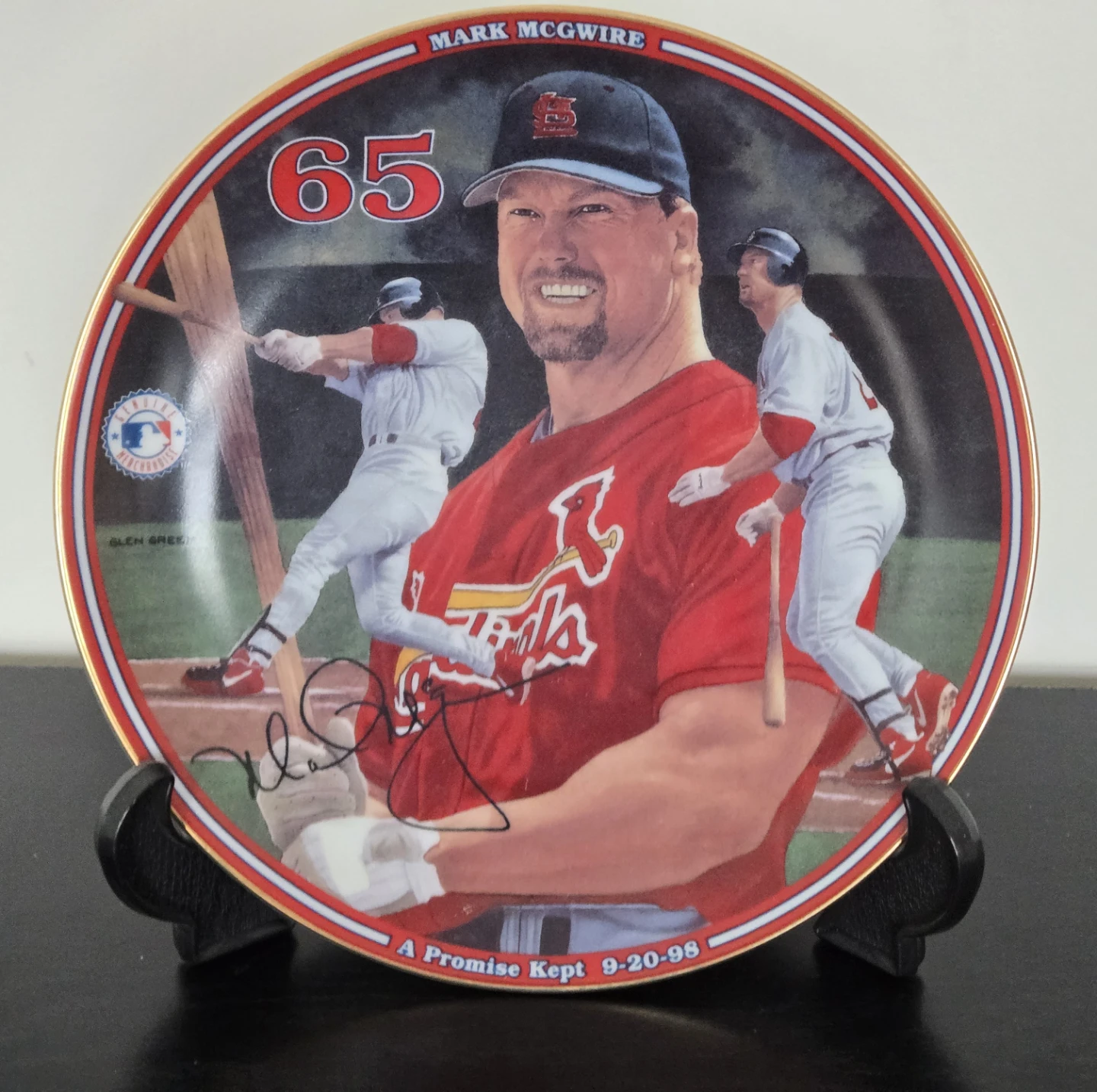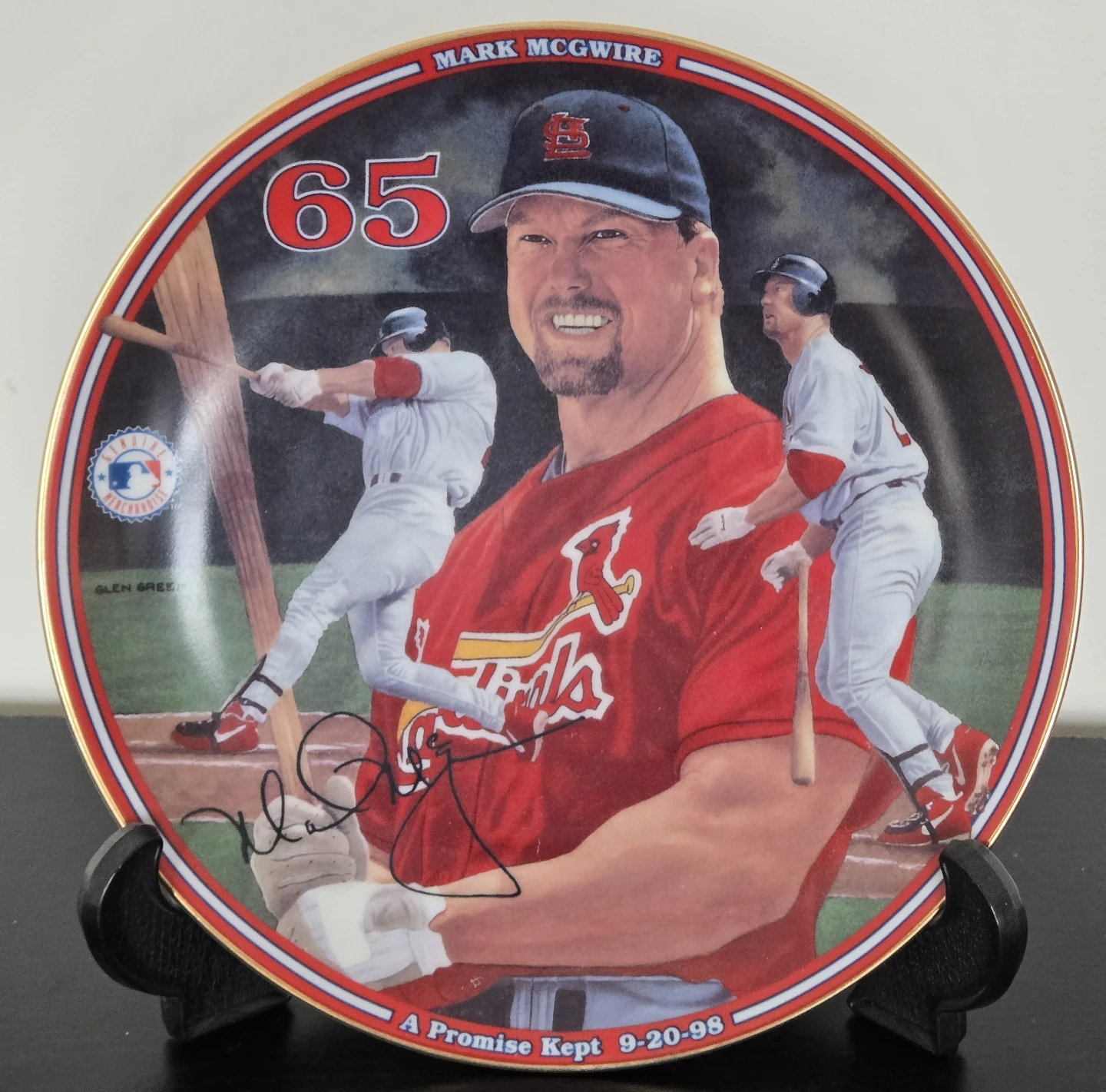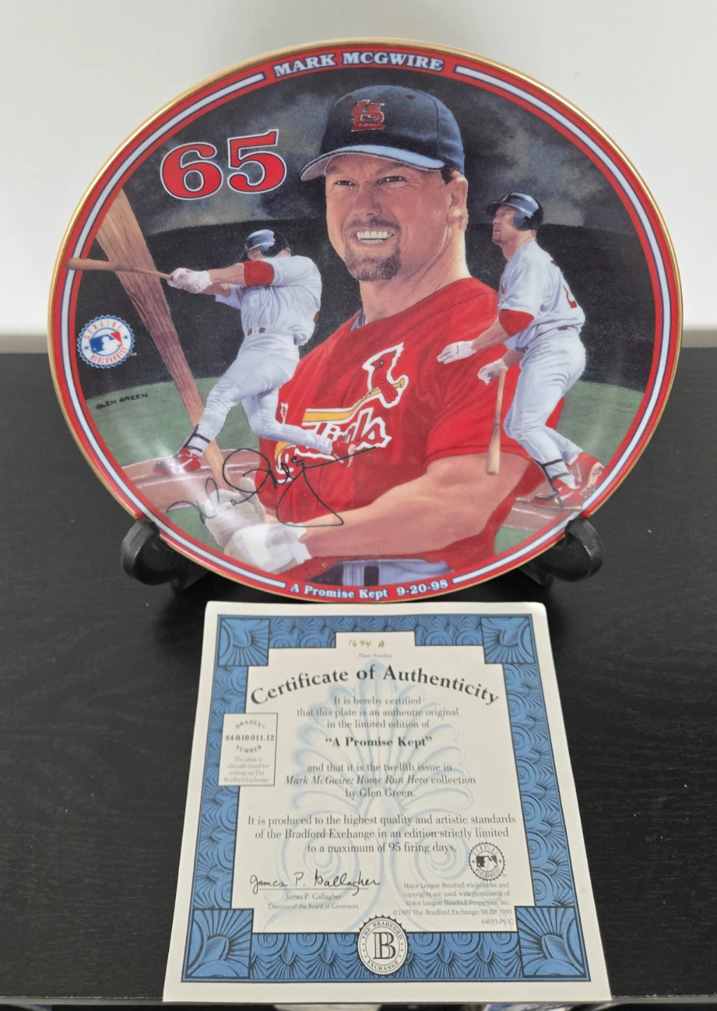 This is the twelfth issue in the Mark McGwire: Home Run Hero collection. It's produced on hard-fire porcelain and is limited to a maximum of 95 firing days. The plate features "A Promise Kept" with the date 9-20-98. It's officially licensed by Major League Baseball.
