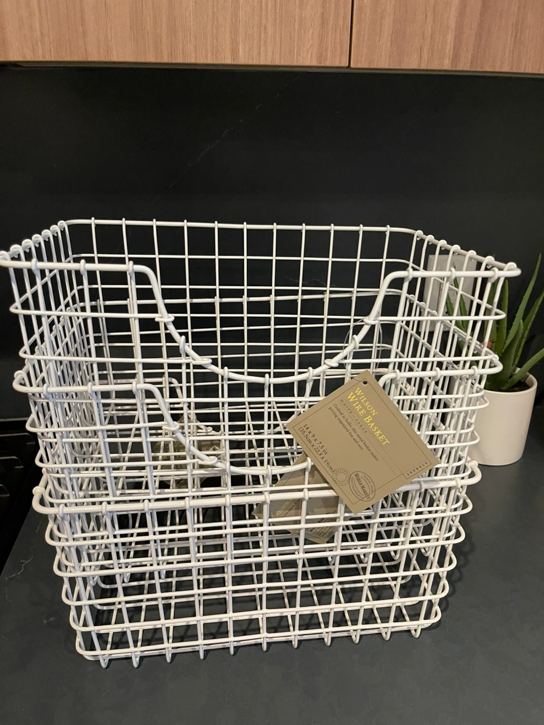 This is a white wire storage basket. It's a durable and practical solution for organizing various items. The open design allows for easy visibility and access to contents.