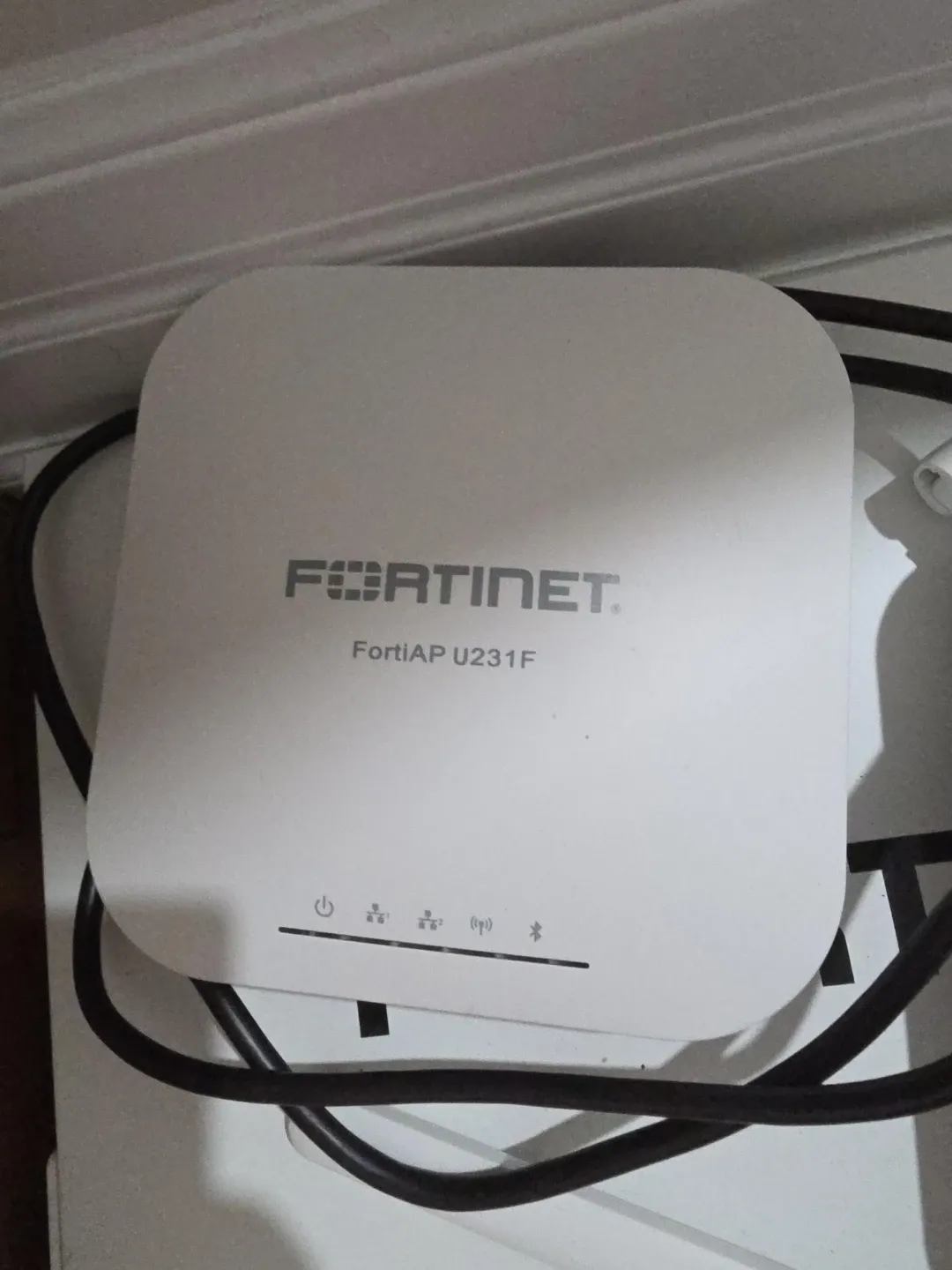 This is a Fortinet FortiAP U231F wireless access point. It's a white device with indicator lights for power, radio, and network status. Includes power cable.