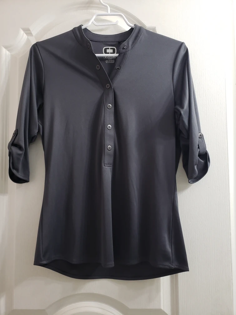 This Ogio women's shirt is made of 100% polyester. It's a size M/M and features a button-up front with roll-tab sleeves. This would be a nice addition to a casual wardrobe!
