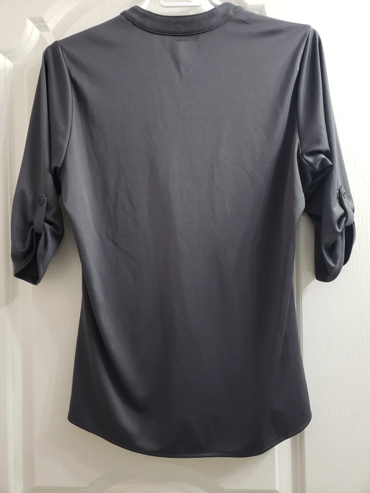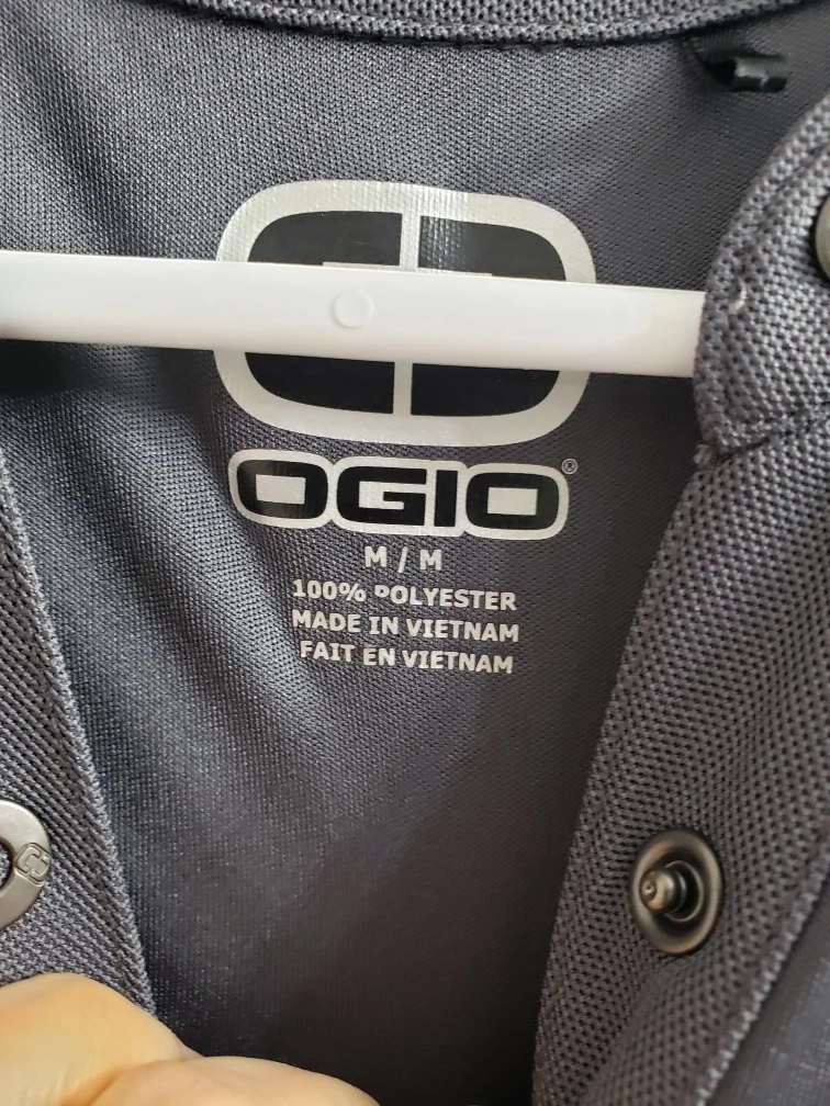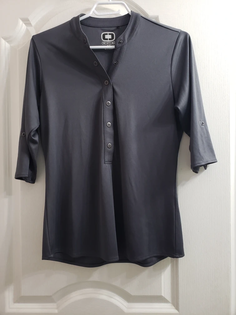 This Ogio women's shirt is made of 100% polyester. It's a size M/M and features a button-up front with roll-tab sleeves. This would be a nice addition to a casual wardrobe!