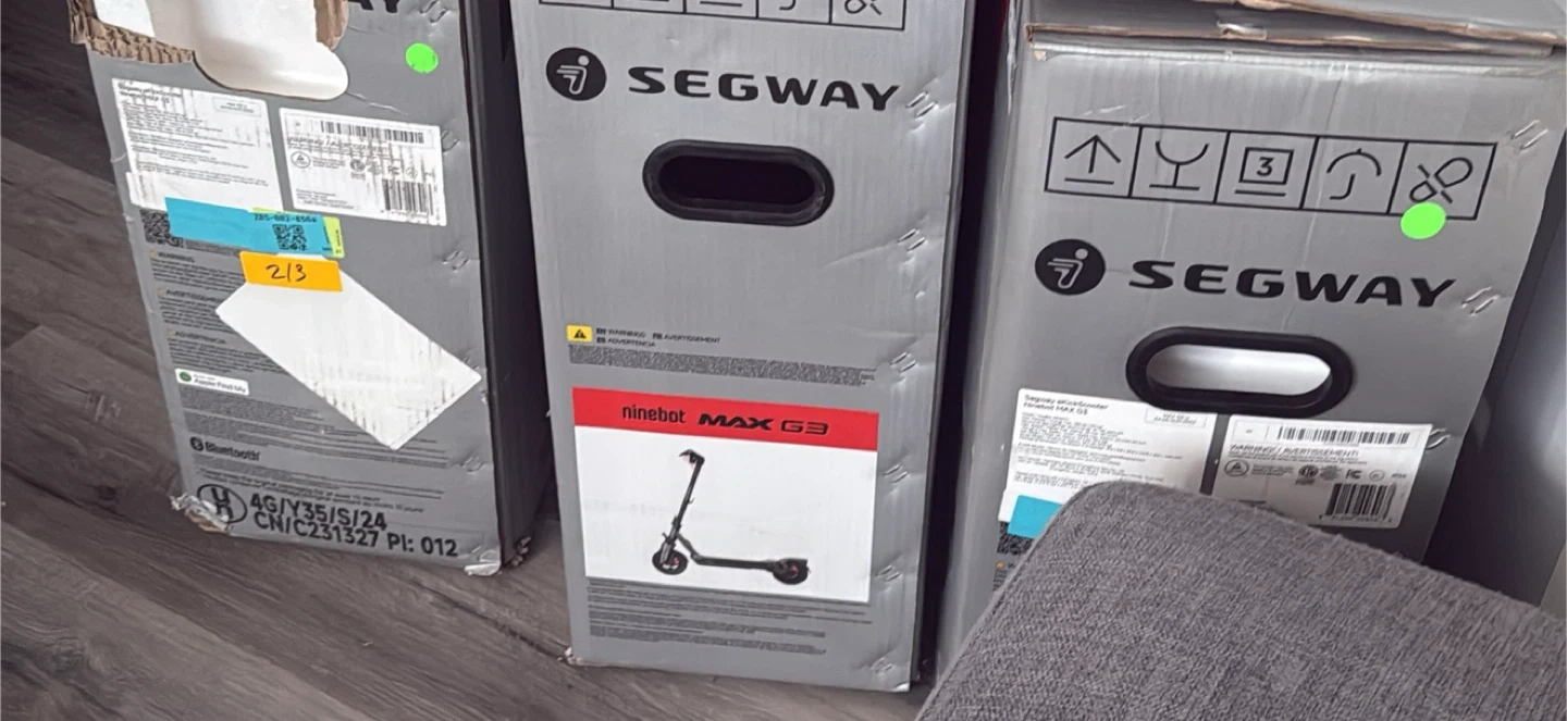 Segway Ninebot MAX G3 electric scooter in original packaging. Features a smart TFT display and dual hydraulic suspension for a smooth ride. Max speed up to 30 mph (48 km/h). This scooter is built for performance and comfort on your commute!