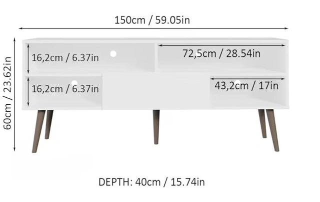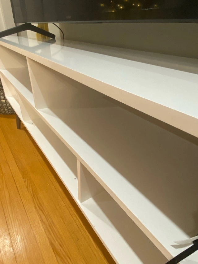 This TV stand is in really good condition and can accommodate up to a 65" TV. The bottom middle cabinet originally had a latch door, but the hinge broke, so it was removed. Dimensions are listed in the photos. Located near Markham & Kingston.