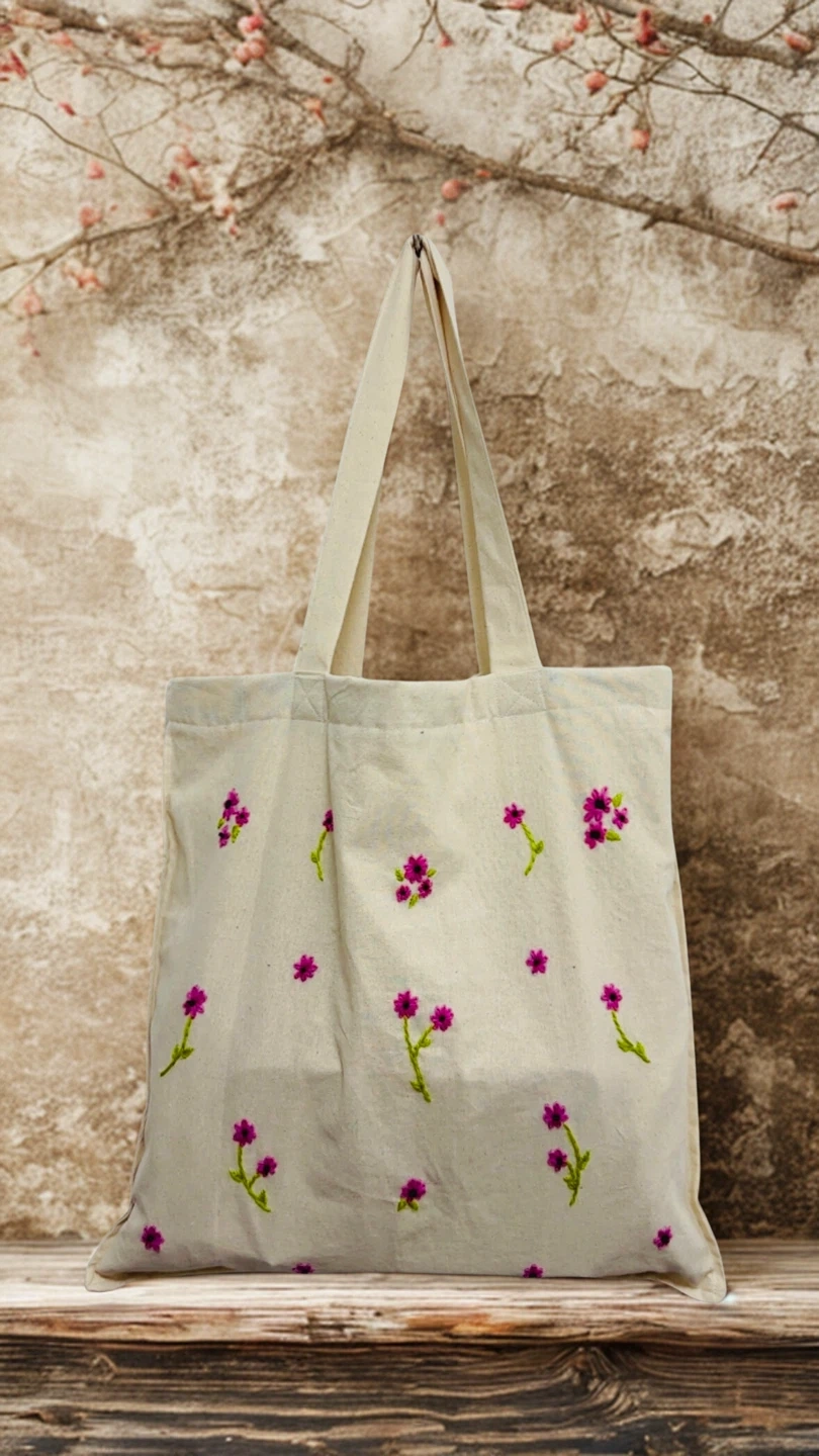 Beautiful beige cotton tote bag with delicate hand-embroidered pink flowers ๐บ โ perfect for everyday use, shopping, or carrying books.