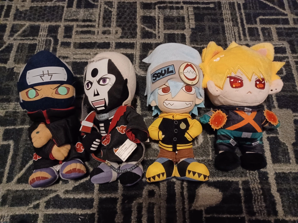 Set of 4 anime plushies. One is a character from Soul Eater, one is from My Hero Academia, and two are from Naruto. Sold as a set.