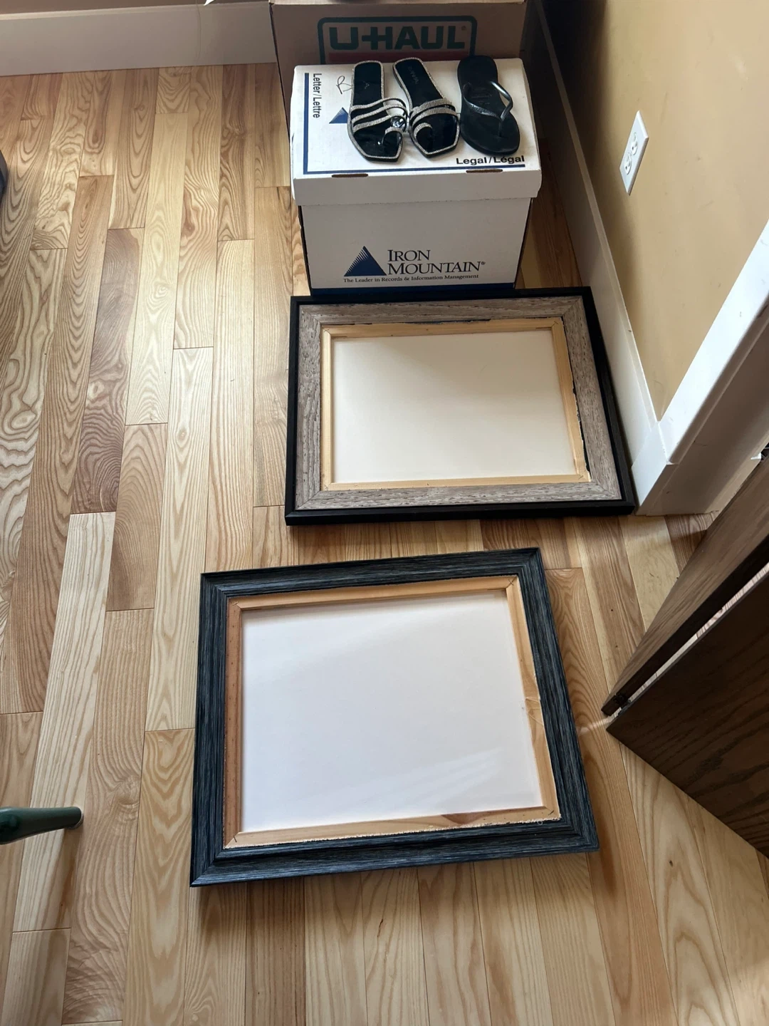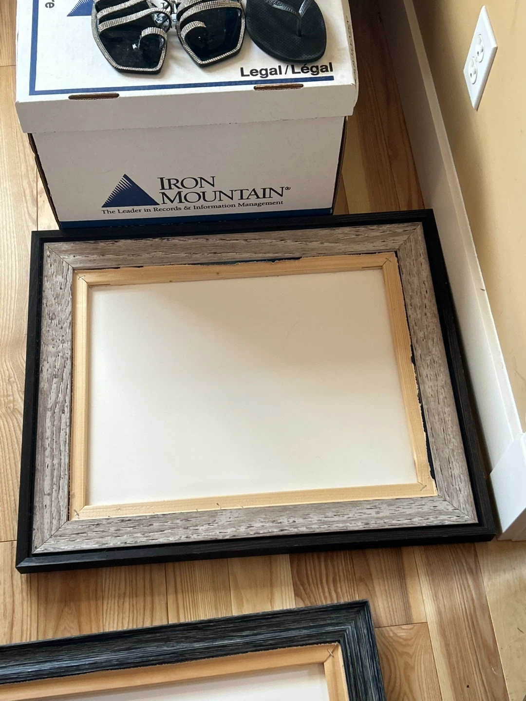 Two picture frames with textured wood-like finishes. One frame has a grey and black distressed look, and the other has a lighter grey wood texture. They're ready for your favourite photos or art!