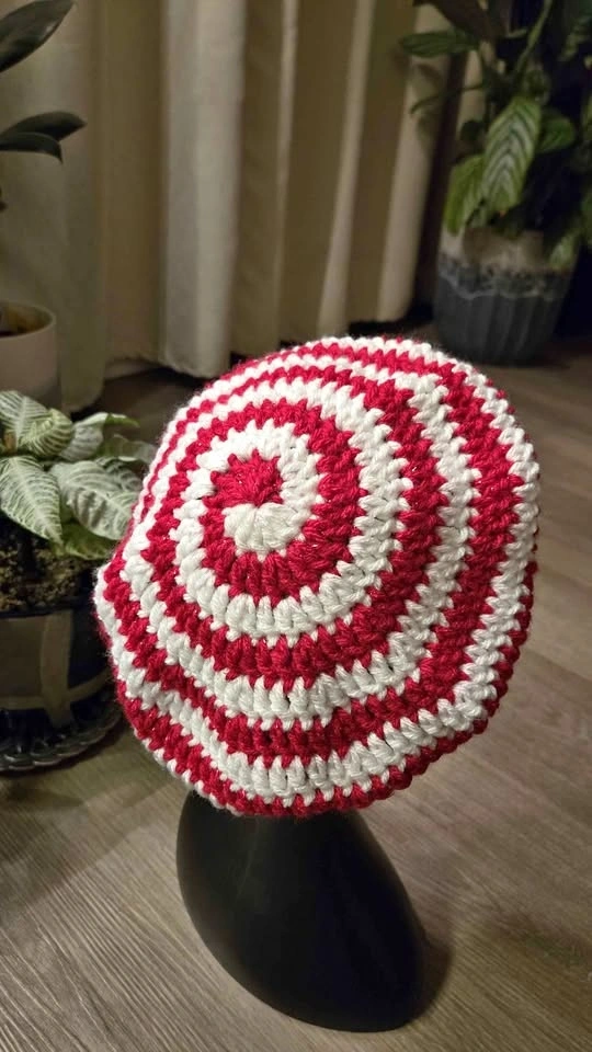 Handmade Peppermint Candy Hats. Red and white fits sizes 5-10. Coral and white fits small adult. Accepting orders for custom sizes and colors with a $20 non-refundable deposit. Prices will vary depending on size.