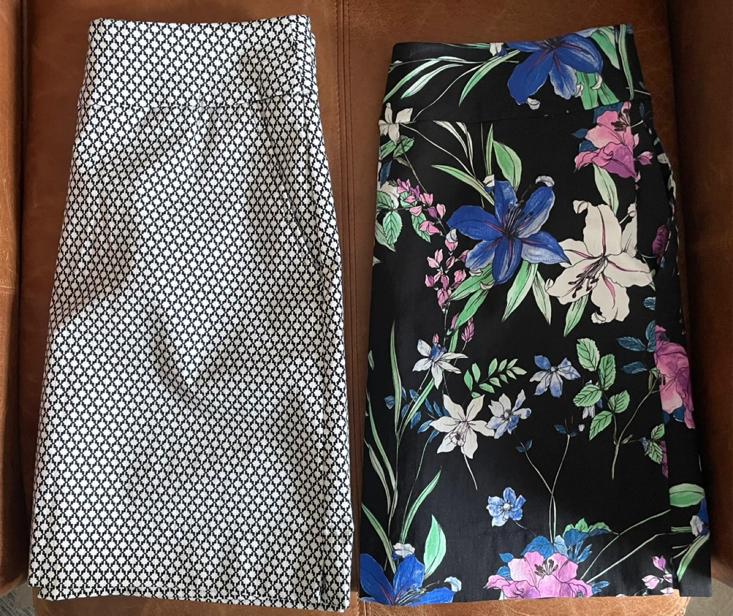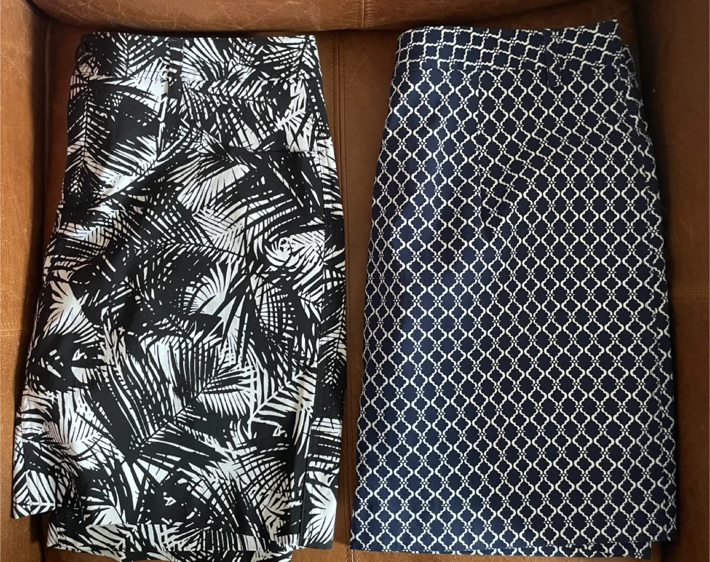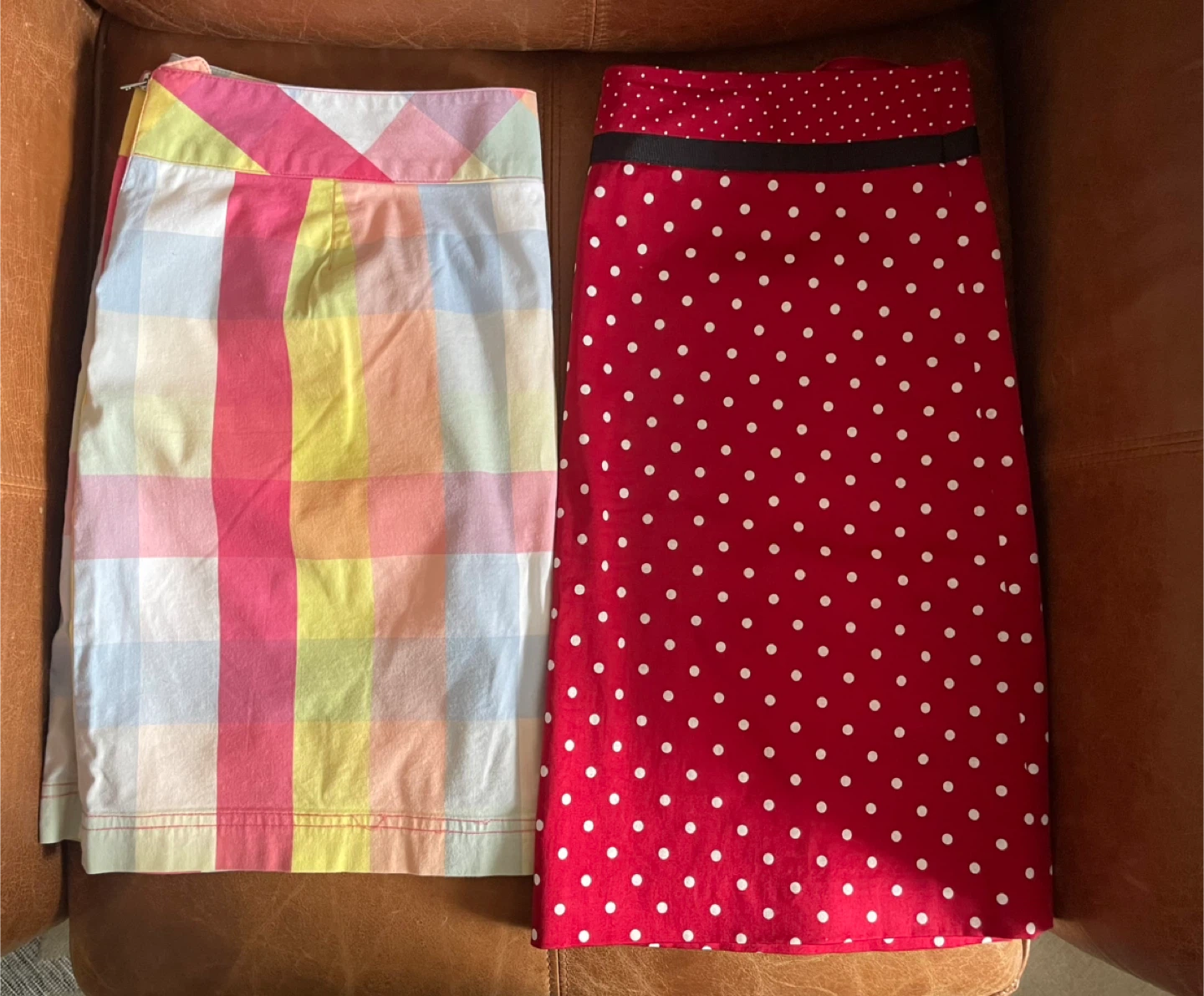 Very good condition… different brands include Roots, puma , etc. Collection of 14 skirts featuring diverse prints and colours. Includes striped, floral, plaid, polka dot, and geometric designs. Various materials for different styles. Size: Large and Medium
