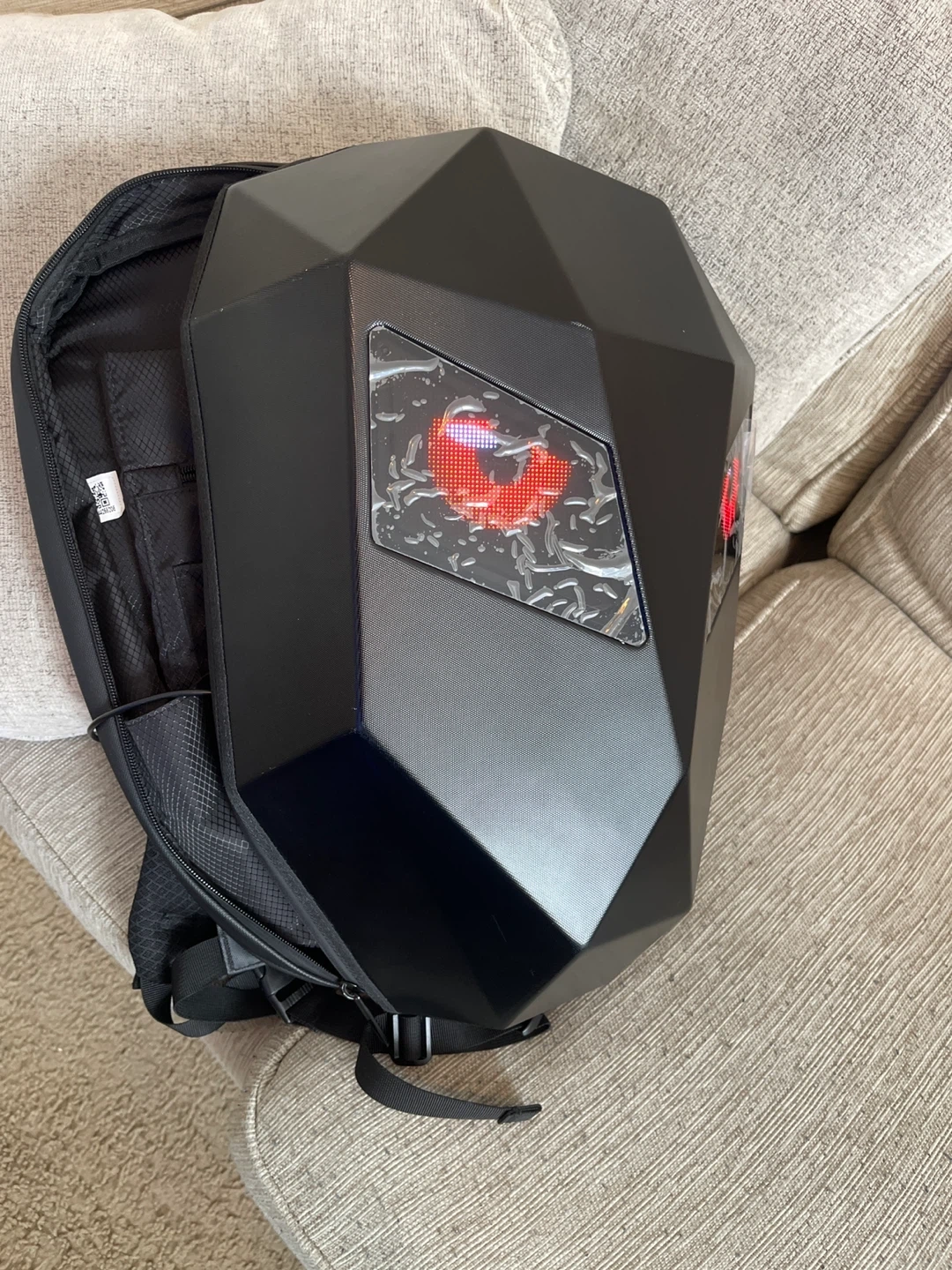 This black geometric backpack features a unique hard-shell design with a clear panel that can display LED patterns. It has a spacious interior with compartments for organization and padded straps for comfort. Integrated USB charging port available.