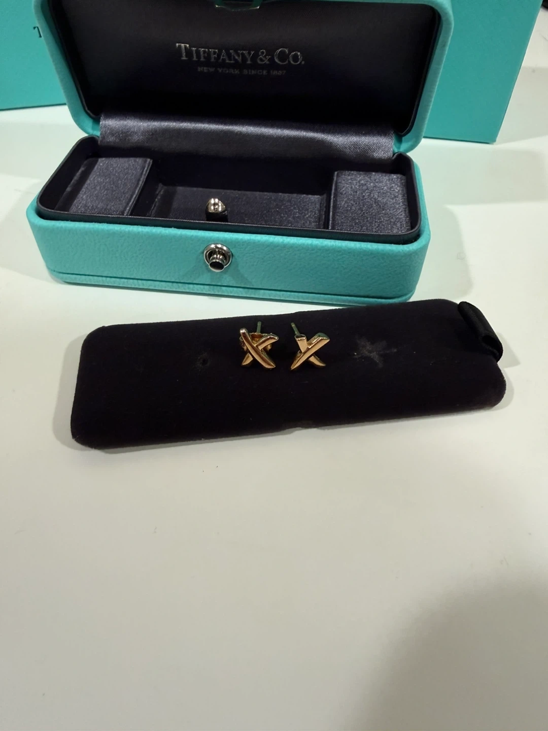 Selling a pair of Tiffany & Co. Paloma Grafiti X gold earrings! They come with the original box. These earrings are a beautiful and classic design from a well-known brand, perfect for any occasion.