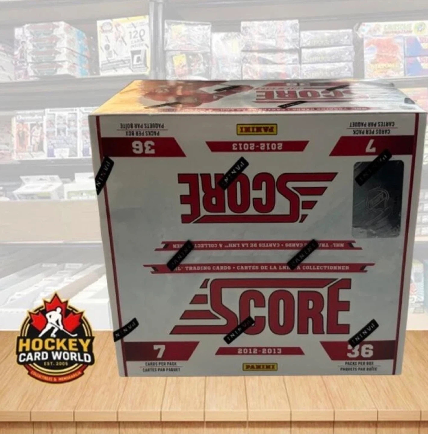 This is a sealed 2012-2013 Panini Score NHL trading cards box. It contains 36 packs per box, with 7 cards per pack. These are NHL trading cards for collectors.