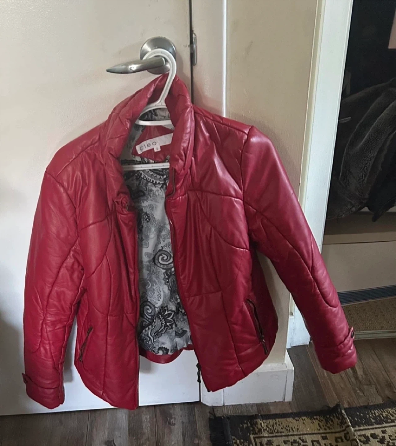 Selling a stylish red puffer jacket from Cleo! It's in great condition and perfect for adding a pop of colour to your wardrobe. The jacket features a unique quilted design and a comfortable lining with a paisley pattern