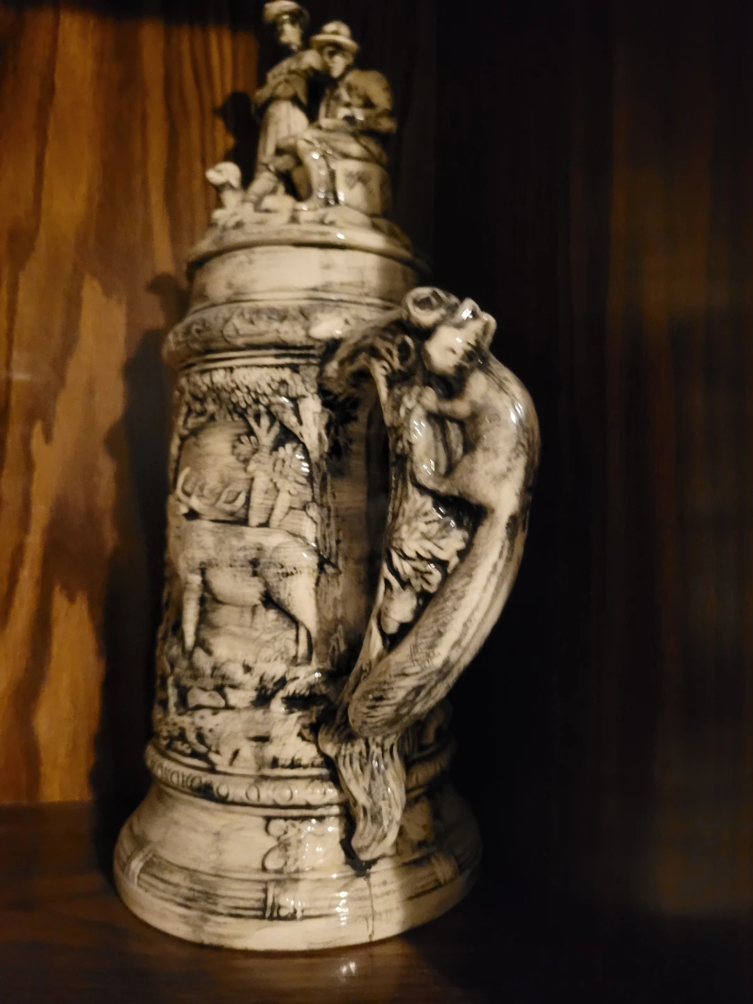 This vintage beer stein features an intricate hunting scene relief. It has a unique handle design and a lid topped with two figures. It's a decorative piece for any collection.