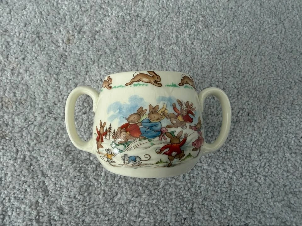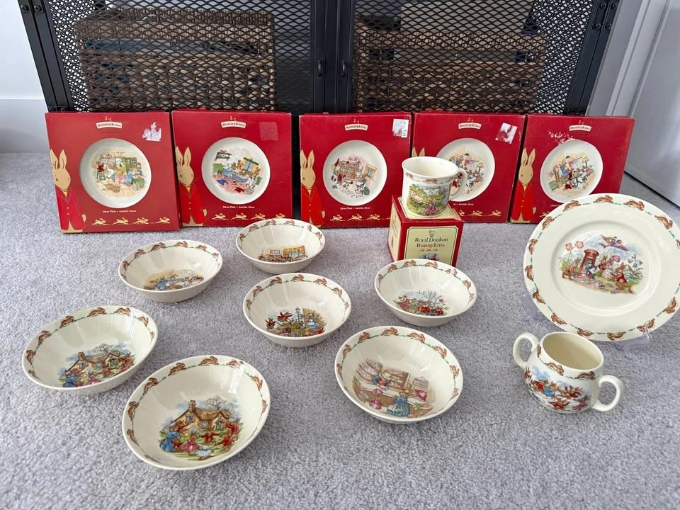 Beautiful Royal Doulton Bunnykins collection featuring classic vintage illustrations. Includes 15 pieces total: 7 Bunnykins bowls, 6 Bunnykins plates (5 with original boxes), 1 Bunnykins mug (with original box), and 1 Bunnykins two-handle baby cup. Several pieces come with their original boxes, making this a wonderful set for collectors or as baby gifts. Bunnykins is one of the most beloved children’s china lines made by Royal Doulton England. Perfect for collectors, baby shower gifts, nursery décor, or vintage English china lovers. Selling as a complete collection.
