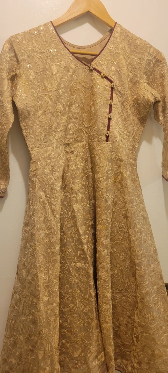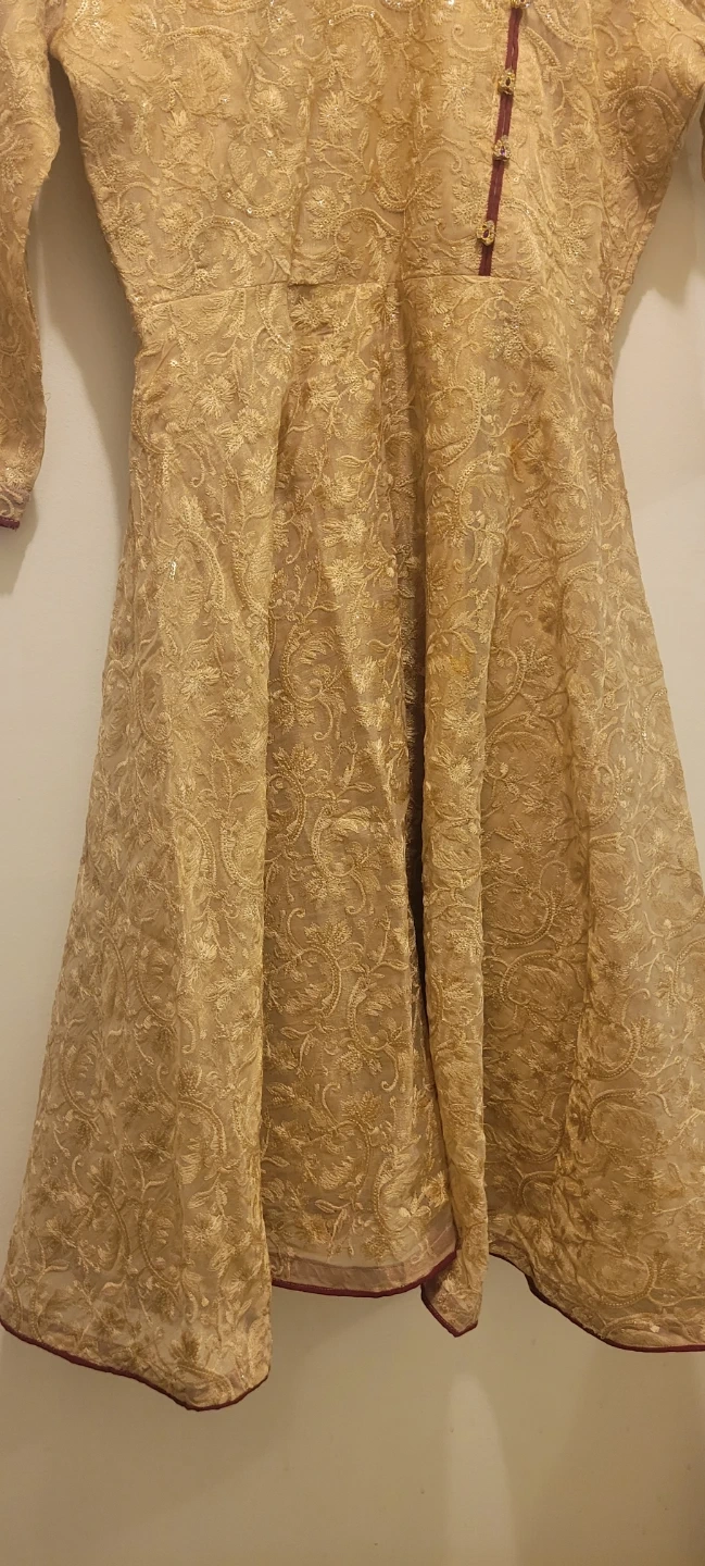 This is a beautiful gold dress with intricate embroidery all over. It features a V-neckline with a decorative placket and contrasting maroon trim on the neckline, cuffs, and hem. The fabric has a subtle shimmer, and the style is flowy, resembling an Anarkali. It's suitable for festive occasions and parties.