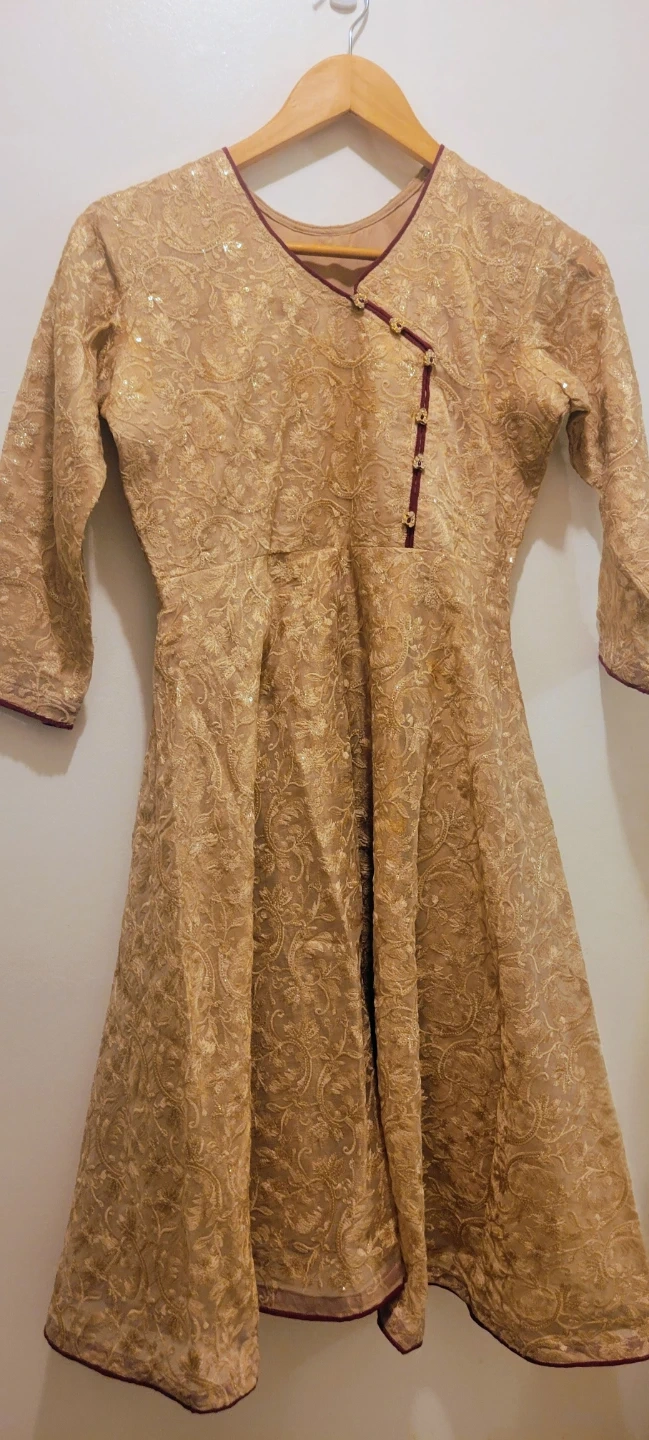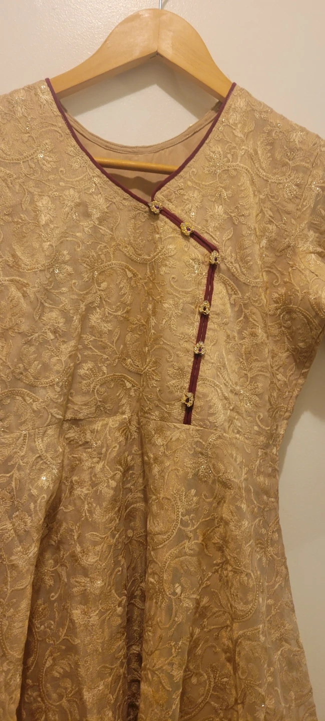 This is a beautiful gold dress with intricate embroidery all over. It features a V-neckline with a decorative placket and contrasting maroon trim on the neckline, cuffs, and hem. The fabric has a subtle shimmer, and the style is flowy, resembling an Anarkali. It's suitable for festive occasions and parties.