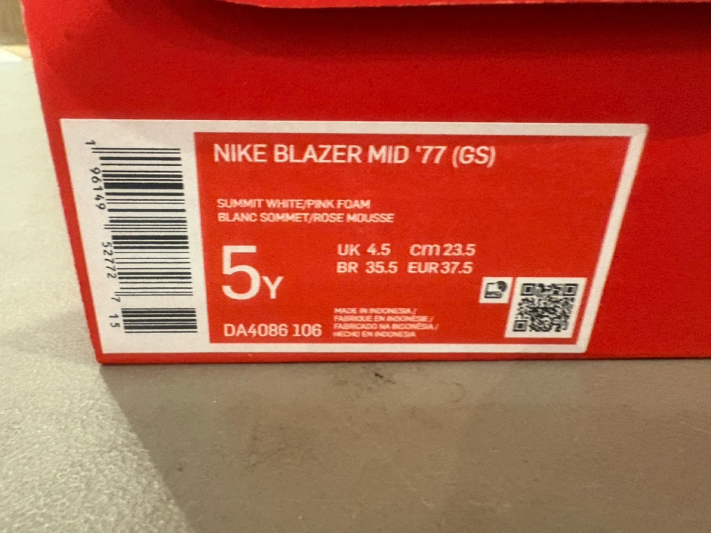 Buy & SellNike Blazer Mid '77 (GS) Shoes - White/Pink Foam - Size 5YNike Blazer Mid '77 (GS) Shoes - White/Pink Foam - Size 5Y$60These Nike Blazer Mid '77 (GS) shoes come in Summit White/Pink Foam. Youth size 5Y (UK 4.5, EUR 37.5, CM 23.5). Includes original box.ConditionNewWHERE TO MEETTim HortonsView MapSELLERverifiedJimmySouthfields Village783 reviews0 chats·0 favorites·2 viewsSEND CHAT TO SELLERHi Jimmy! I’m interested in your listing.Hi Jimmy! I’m interested in your listing.Get the Karrot app to chatSign In to chat
